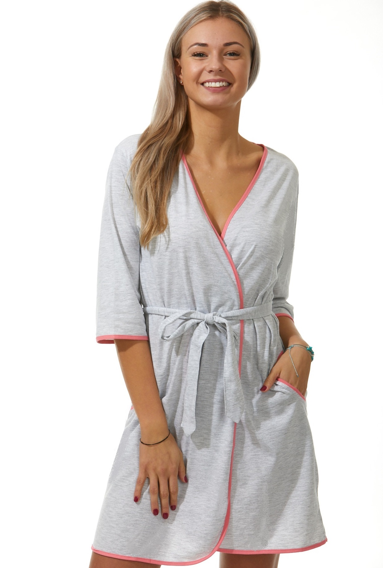 Šedý a růžově lemovaný lehký župan do porodnice na kojení 5XL-7XL