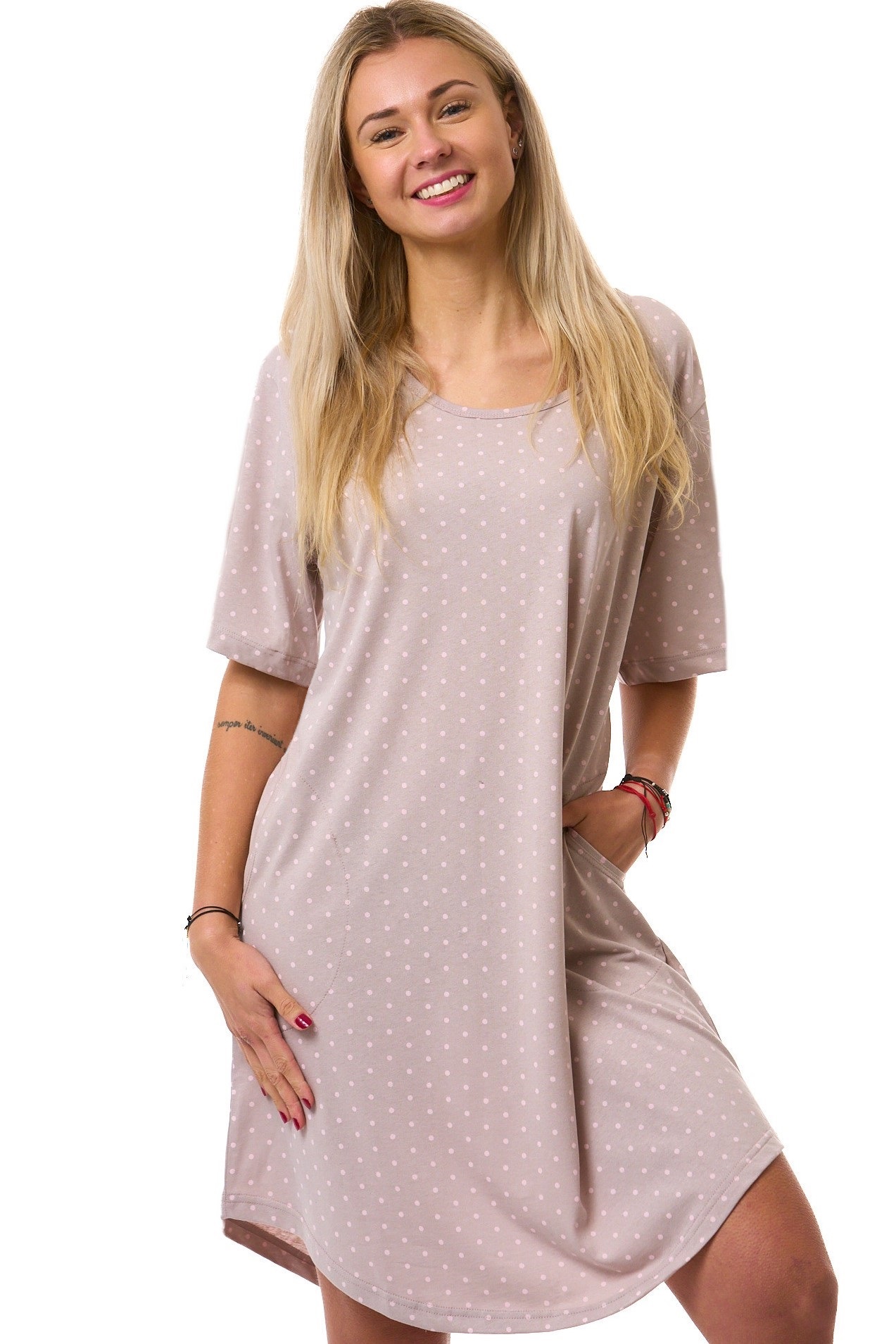 Pohodlná bavlněná dámská noční košile v barvě cappuccino s tělovými puntíky. Nadkolenní délka, kulatý výstřih a praktické kapsy všité na bocích. Ideální pro plnoštíhlé ženy i dívky ve velikostech 1XL–4XL. Měkký a prodyšný bavlněný materiál zajistí příjemný spánek i volné chvíle doma.