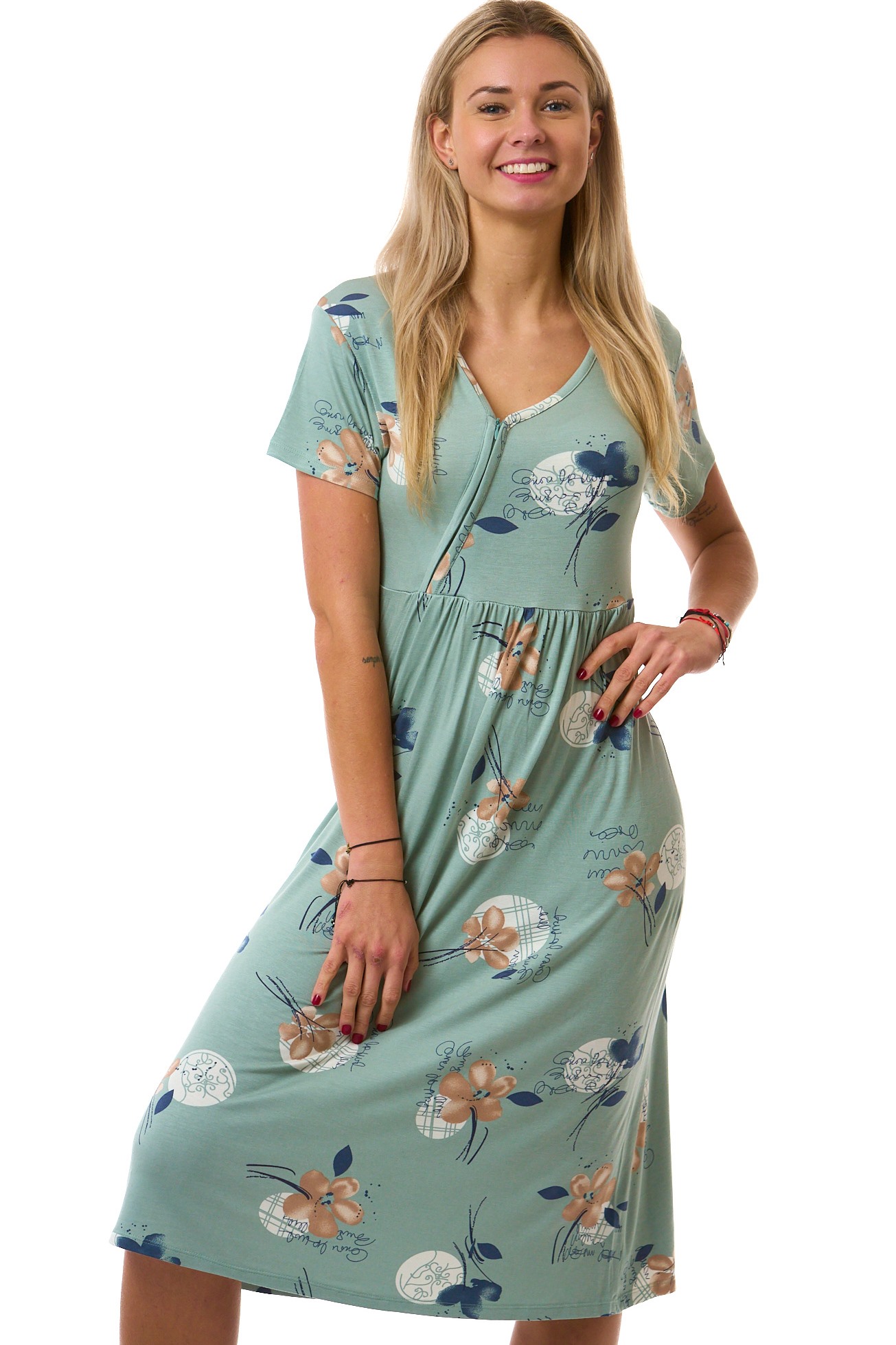 Noční košile z jemného, extra pružného materiálu je velmi příjemná na tělo, oblíbená a chválená ženami pro svůj pohodlný a ženský střih. Má krátký rukáv a vrchní díl tvoří sedýlko s praktickým zapínáním na zip. Košilka se směrem dolů rozšiřuje do áčka a je lehce nabíraná, což lichotí postavě. Zelený základ s hnědými květy, doplněnými o modré lístky a grafická „zrcátka“ ve stylu moderní suché vazby, působí elegantně a originálně.