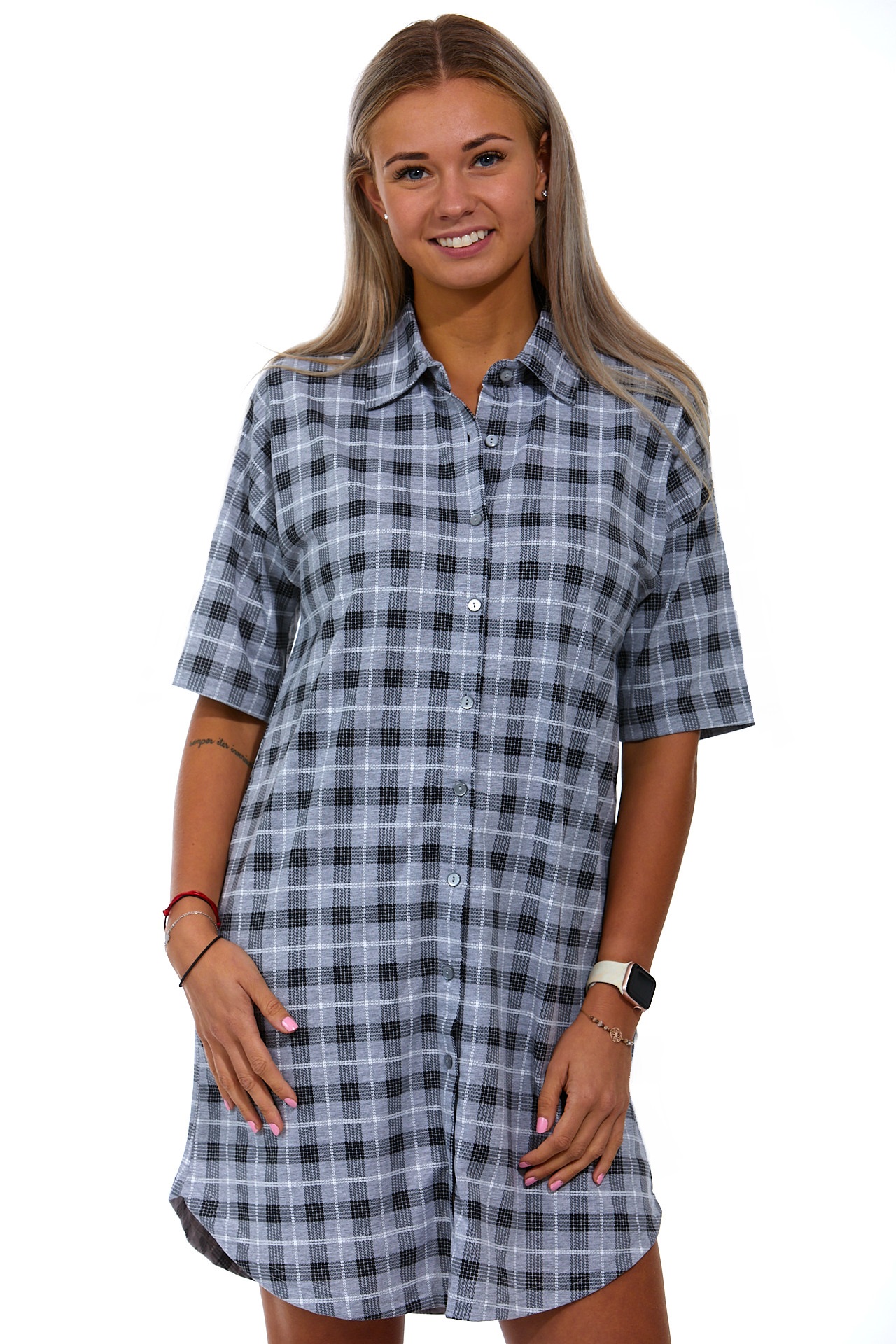 Šedá károvaná celo propínací dámská noční košile s límečkem