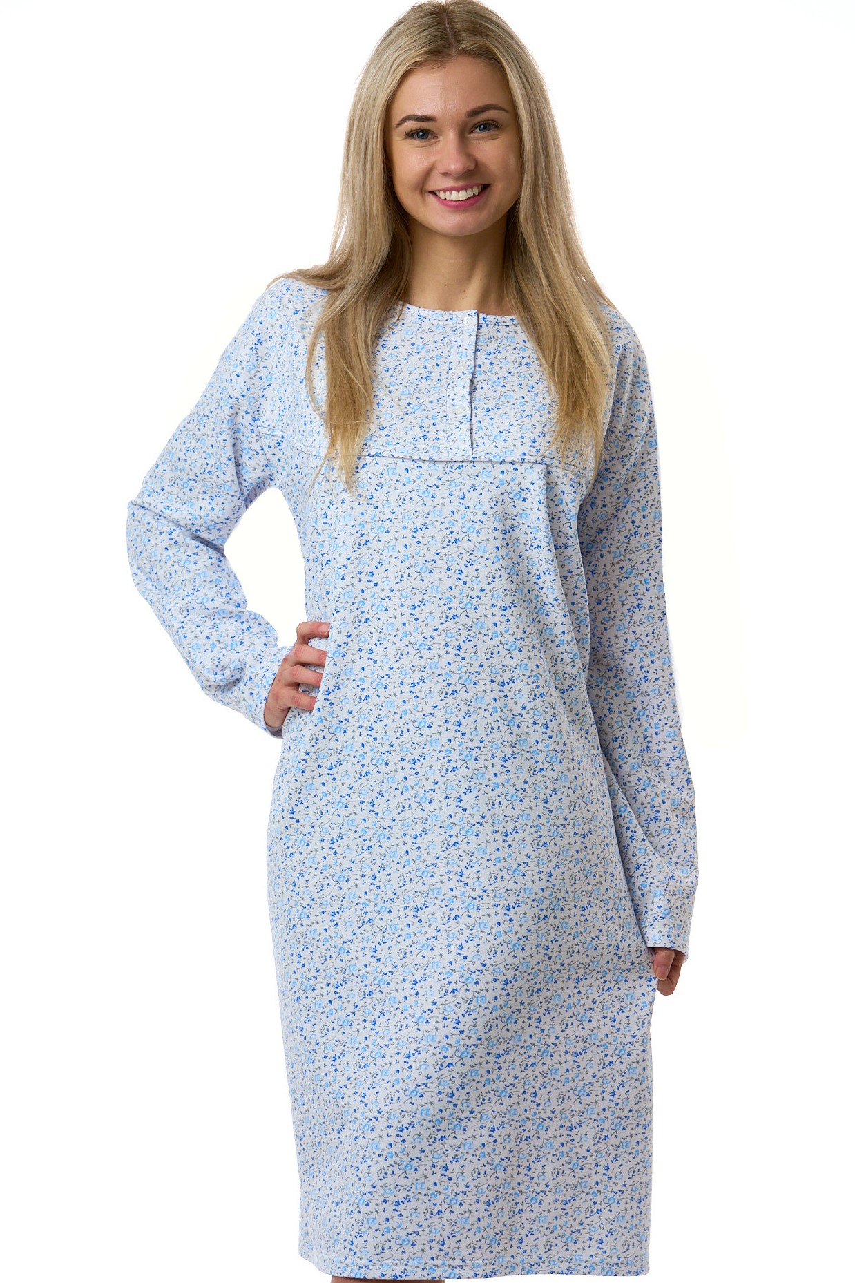 Pohodlná dámská noční košile pro nadměrné ženy ve velikostech 1XL až 4XL. Vyrobená ze silné bavlny s počesaným chlupem na vnitřní straně, který perfektně zahřeje. Má dlouhé rukávy a klasický nabíraný sedýlkový střih ideální pro větší poprsí. Propínání na čtyři knoflíky. Bílý základ s jemným vzorem modrých kytiček.