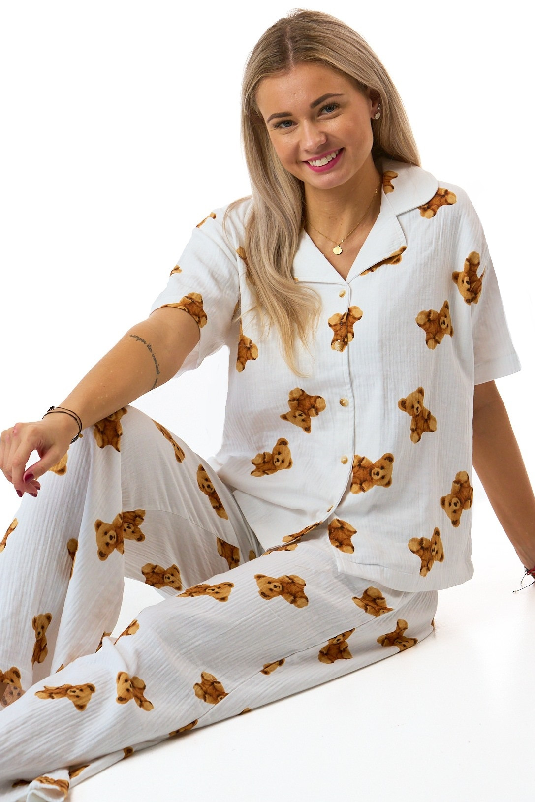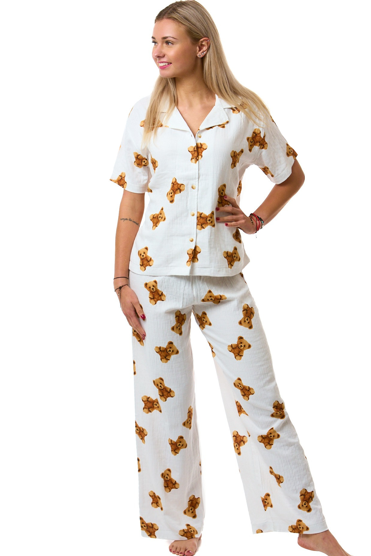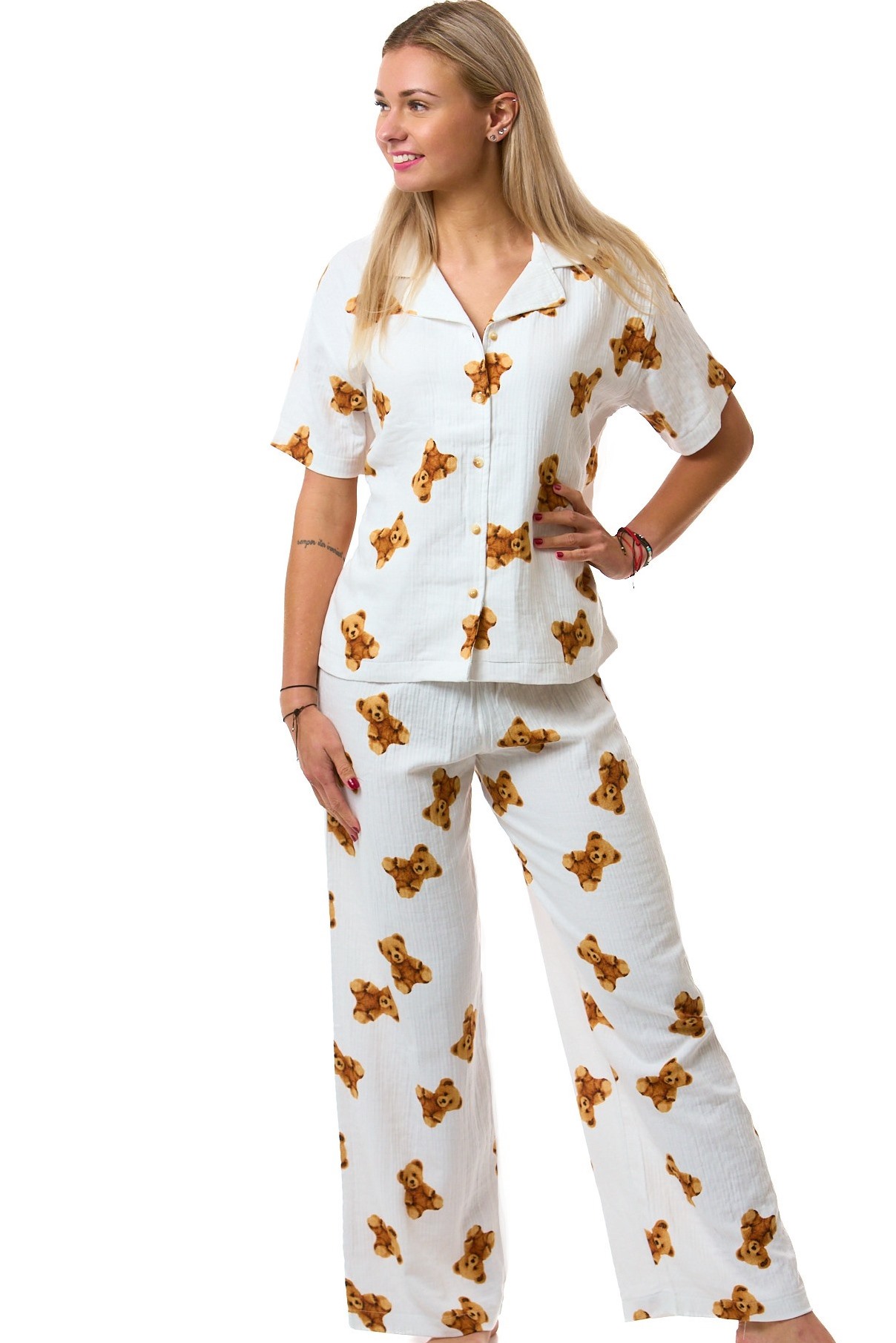 Stylové dámské pyžamo z lehkého a prodyšného mušelínu s krátkým rukávem a dlouhými kalhotami. Vrchní díl je celopropínací na knoflíky, s elegantním límečkem. Kalhoty mají pohodlnou plochou gumu v pase a všité boční kapsy. Bílé pyžamo s roztomilým potiskem hnědých plyšových medvídků.