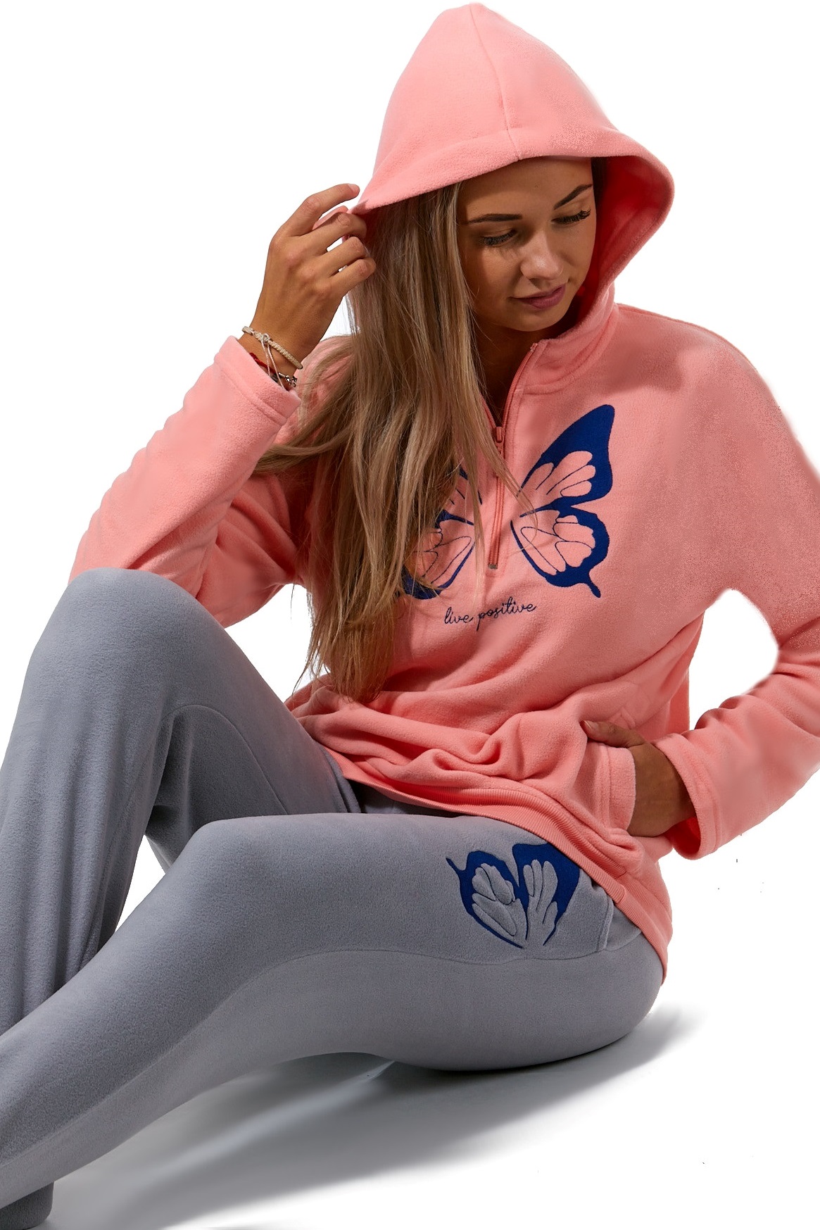 Růžové i šedé luxusní hřejivé dámské pyžamo s kapucí, MOTÝLEK