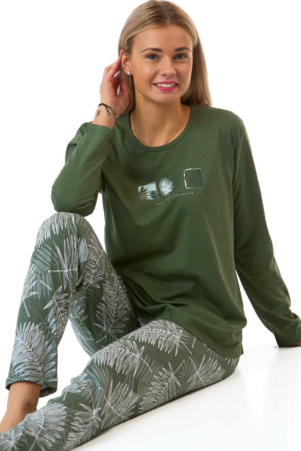 Stylové bavlněné pyžamo v tmavě zelené barvě s jemným grafickým motivem listů v šedých a khaki tónech.