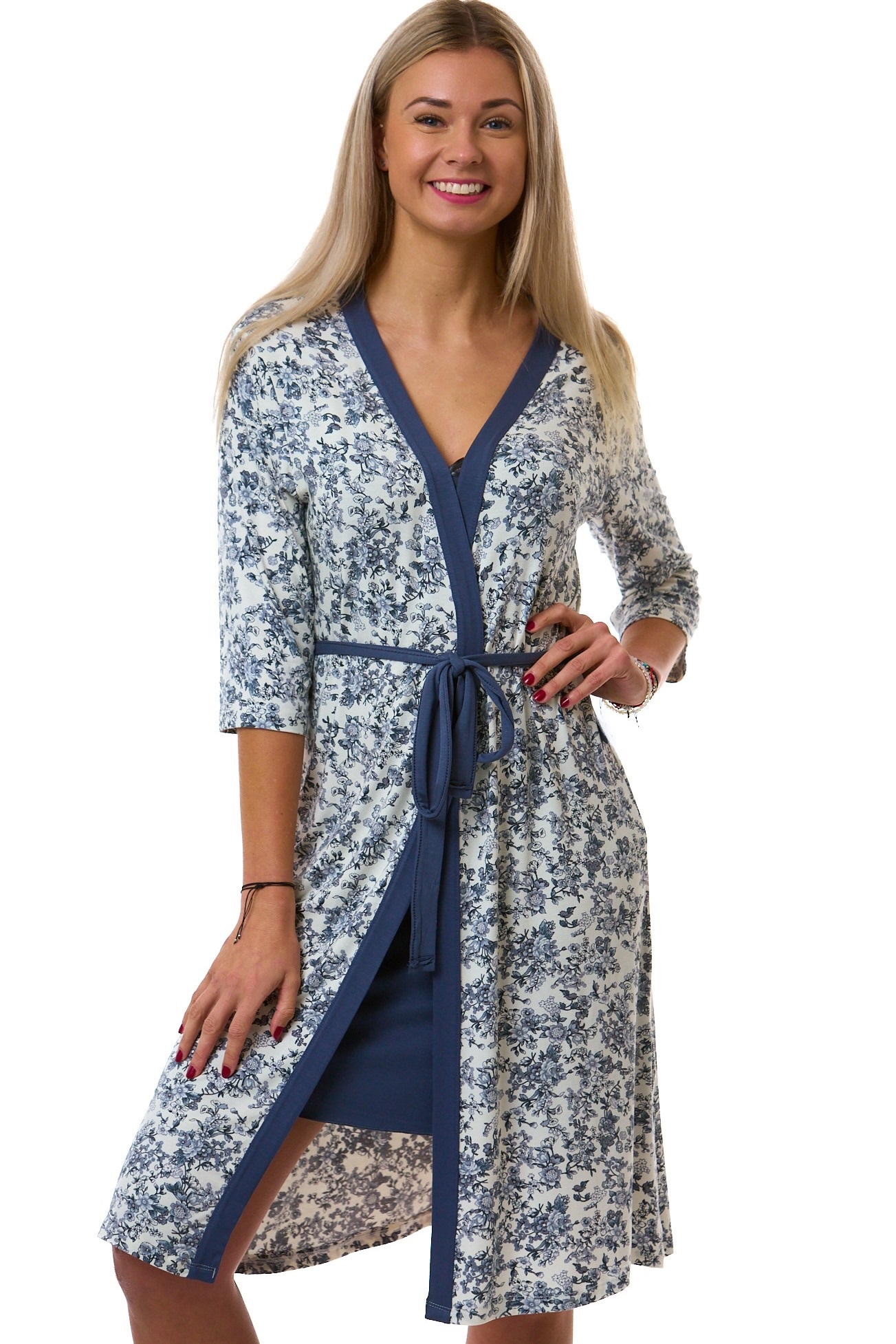 Elegantní dámský komplet z jemného a extra pružného materiálu. Tmavě modrá košilka s krajkou a nastavitelnými ramínky, doplněná bílým županem s tmavě modrým květinovým vzorem.