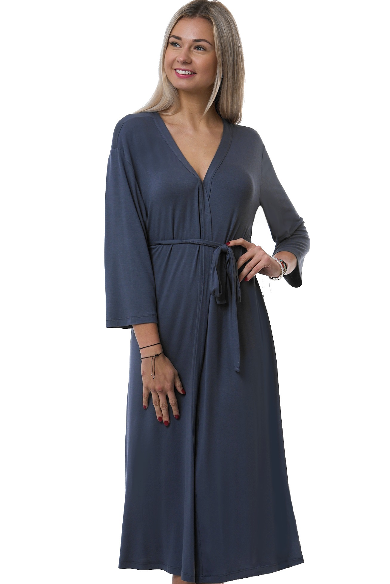 Elegantní šedý dámský župan z lehkého, jemného a pružného materiálu. Delší délka, klasické zavazování s páskem, ideální pro plnoštíhlé ženy ve velikostech 2XL–5XL.