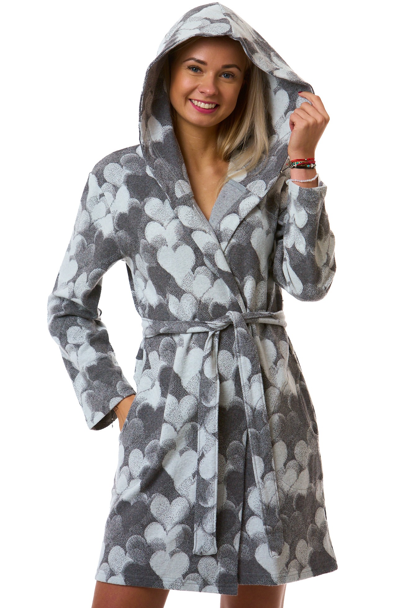 Stylový krátký dámský župan z měkké termo bavlny s hlubokou kapucí a praktickými kapsami na bocích. Moderní celoplošný vzor překrývajících se srdcí v odstínech šedi dodává županu elegantní a zároveň hravý vzhled. Pohodlné zavinovací zapínání na pásek pro dokonalé přizpůsobení postavě. Ideální pro chladná rána i večerní relax.