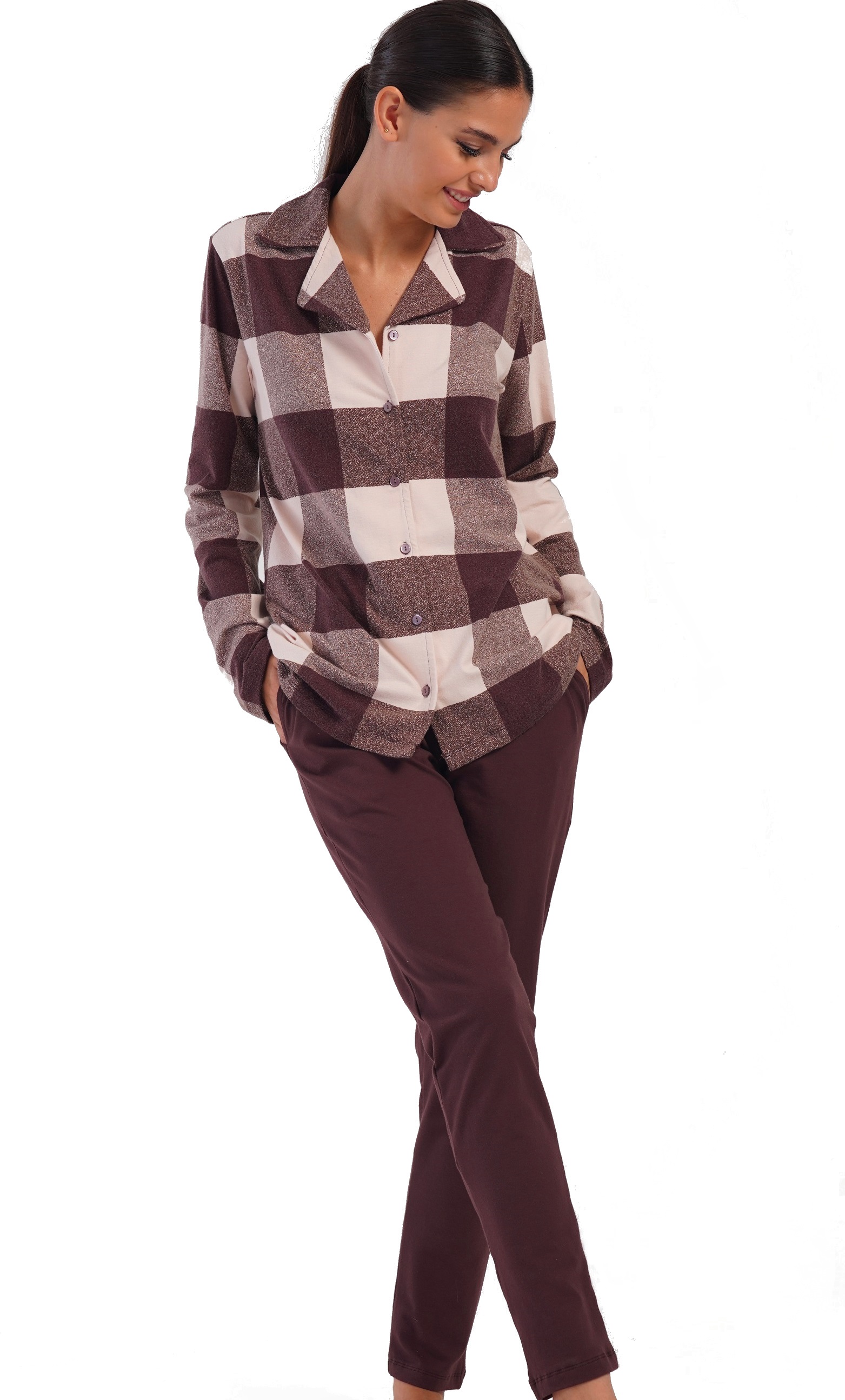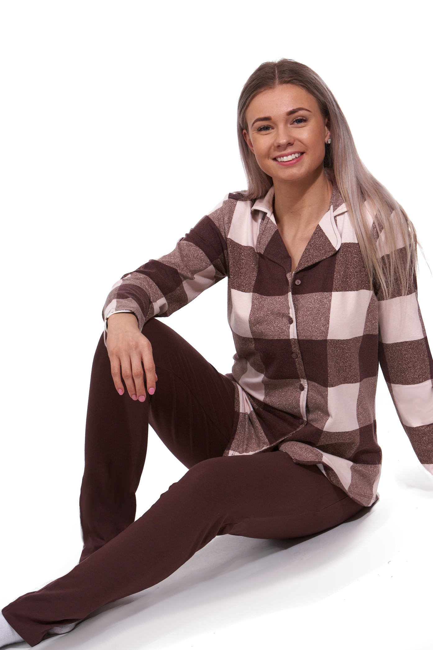 Hnědé i béžové kostkované elegantní pyžamo celopropínací pro ženy či dívky
