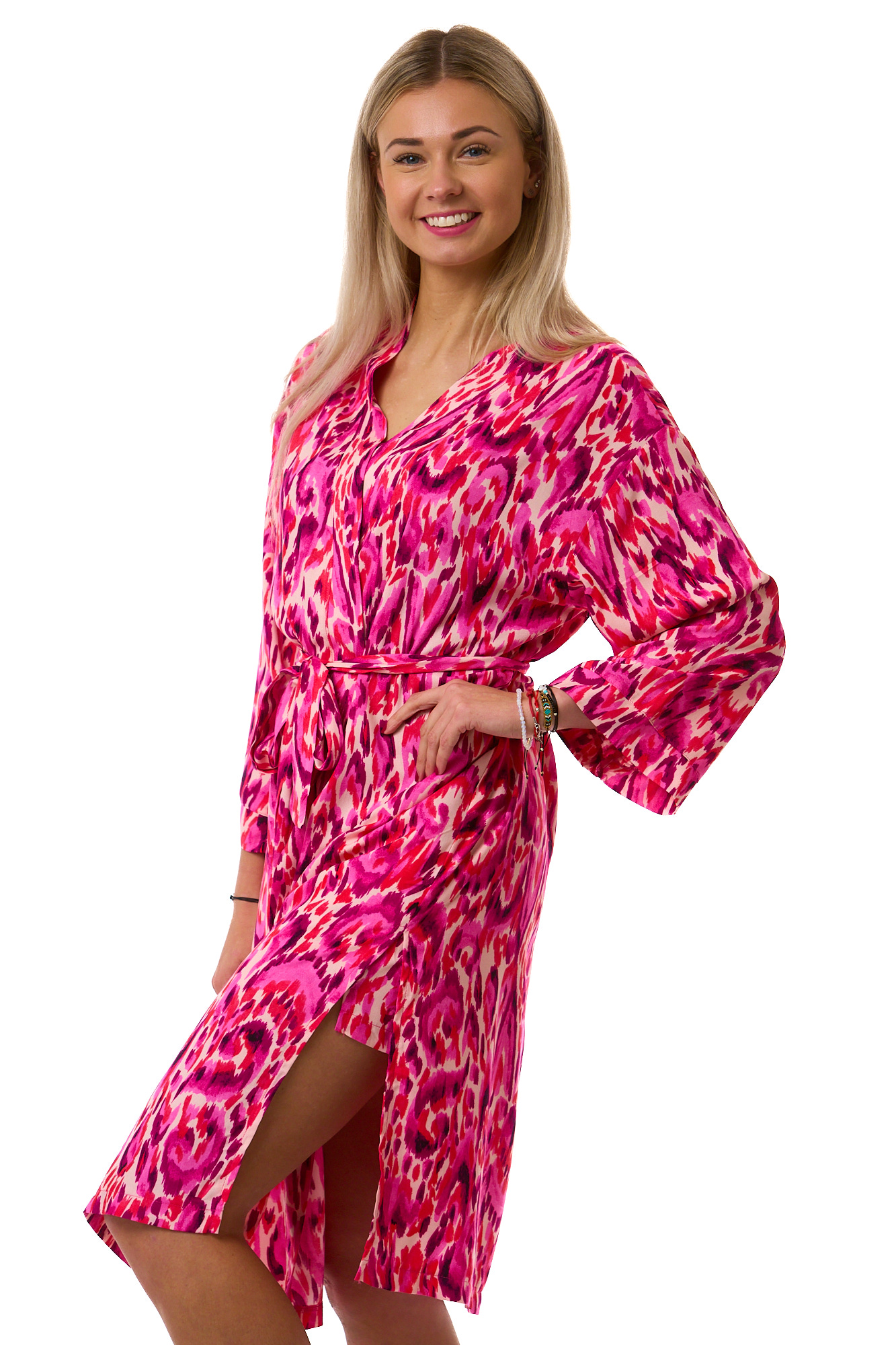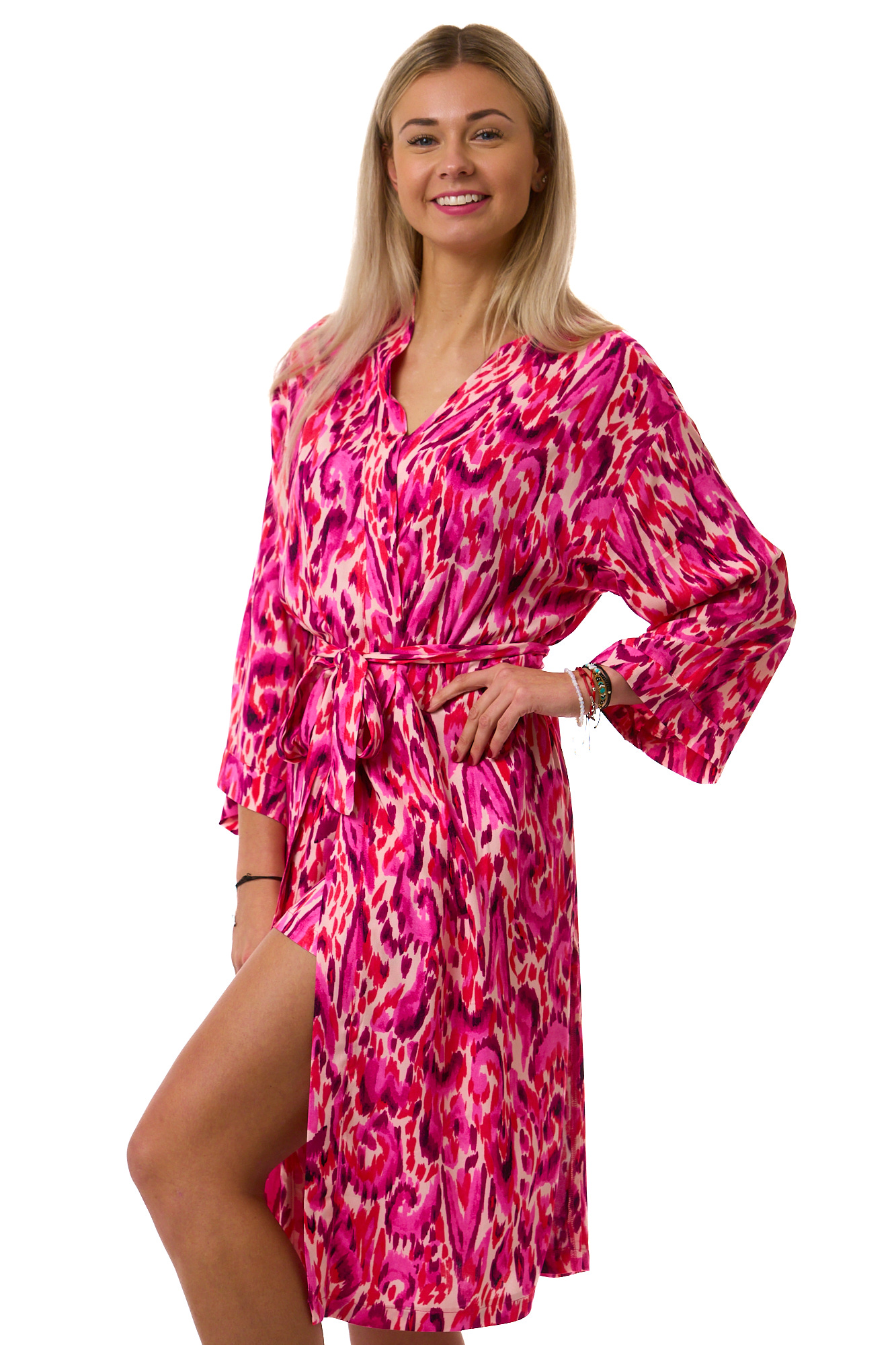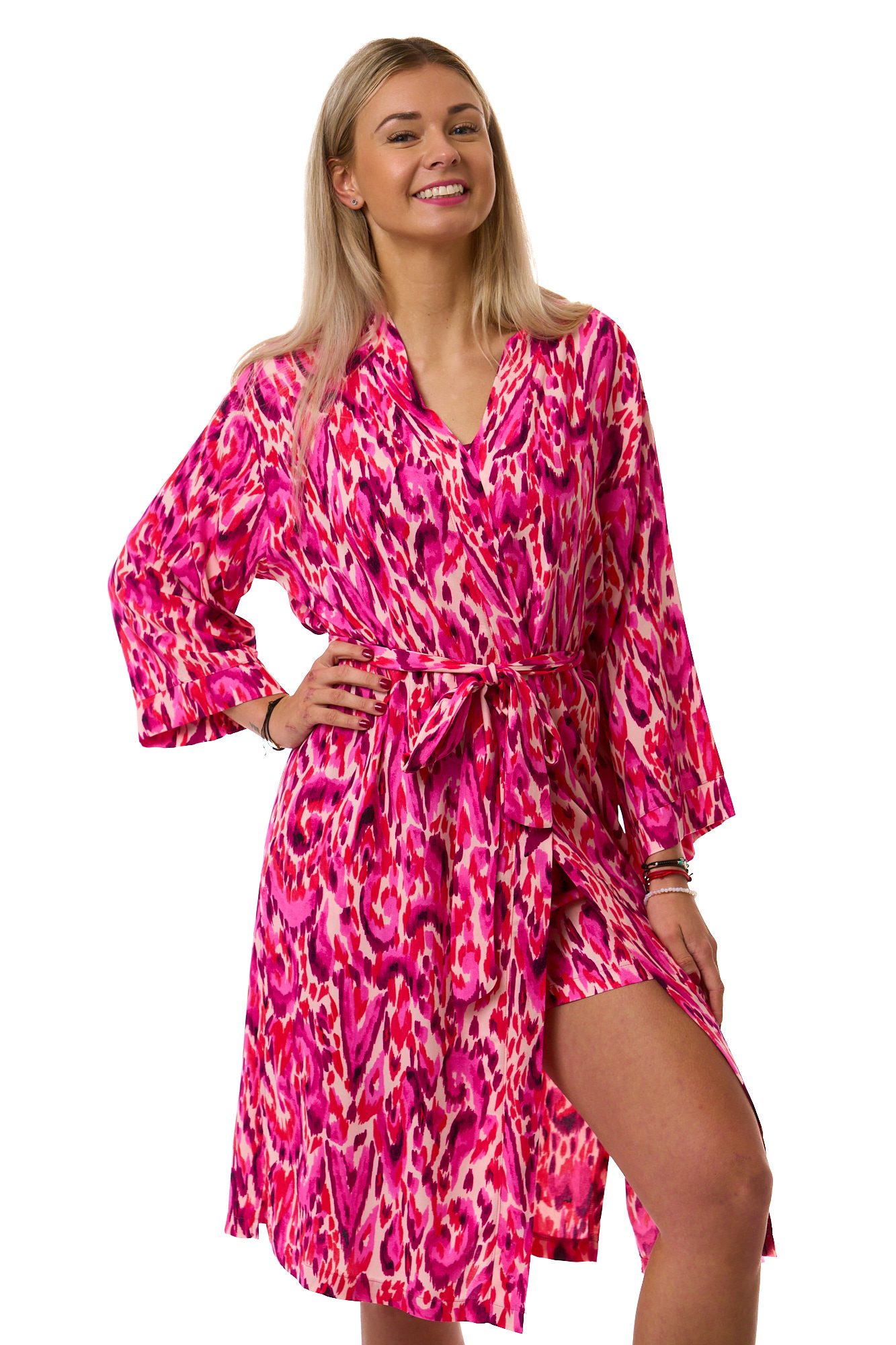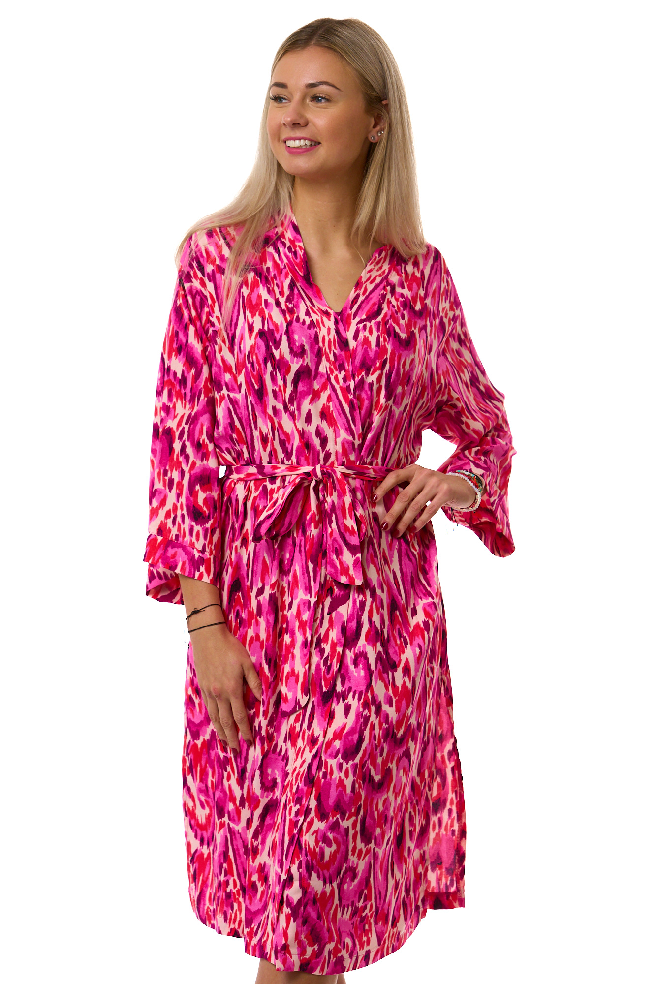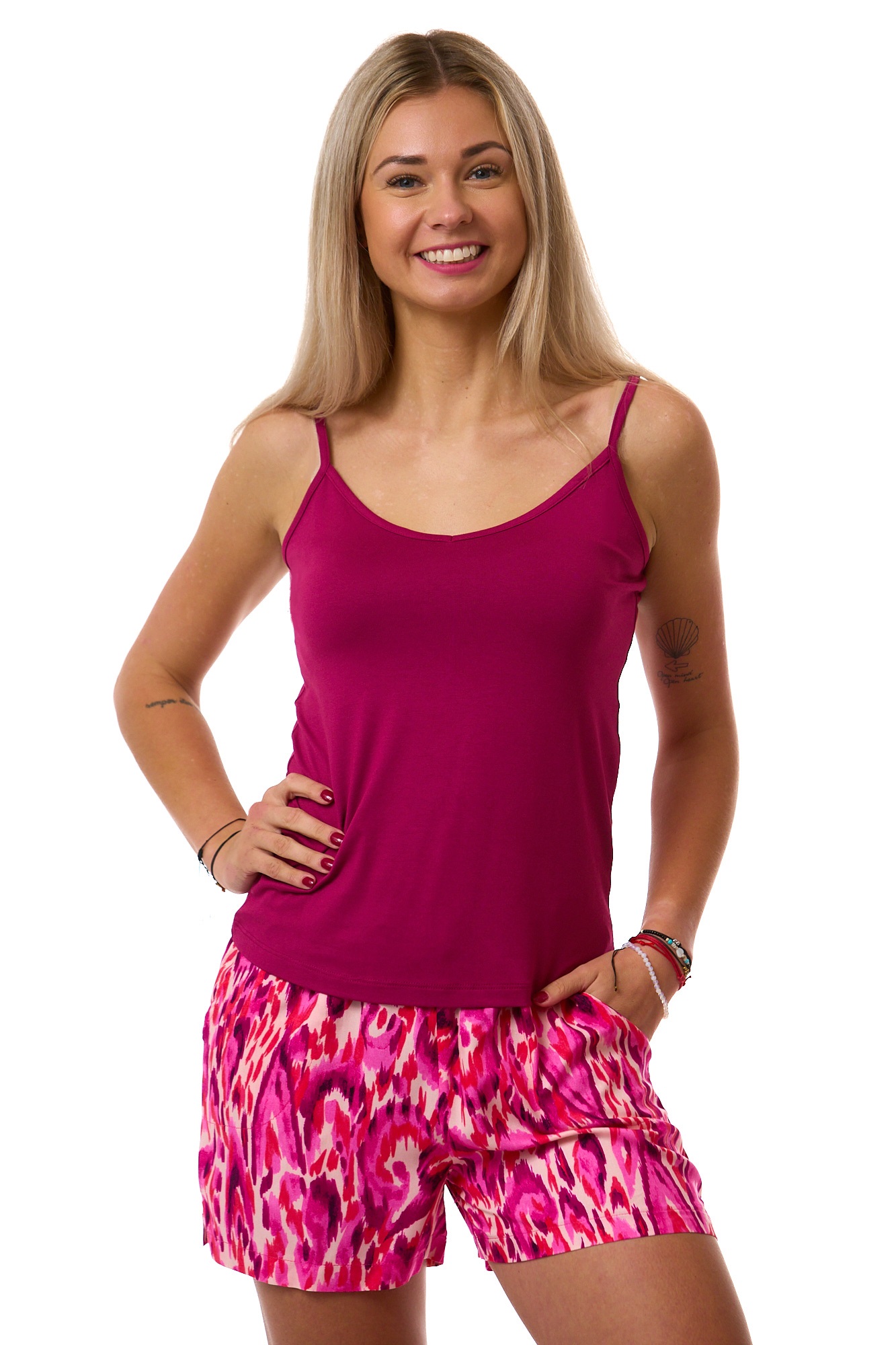 Elegantní dámský komplet z lehkého, jemného materiálu. Vínové tílko s pružnými ramínky doplňují kraťasy a župan s růžovofialovým celovzorem připomínajícím akvarelovou malbu.