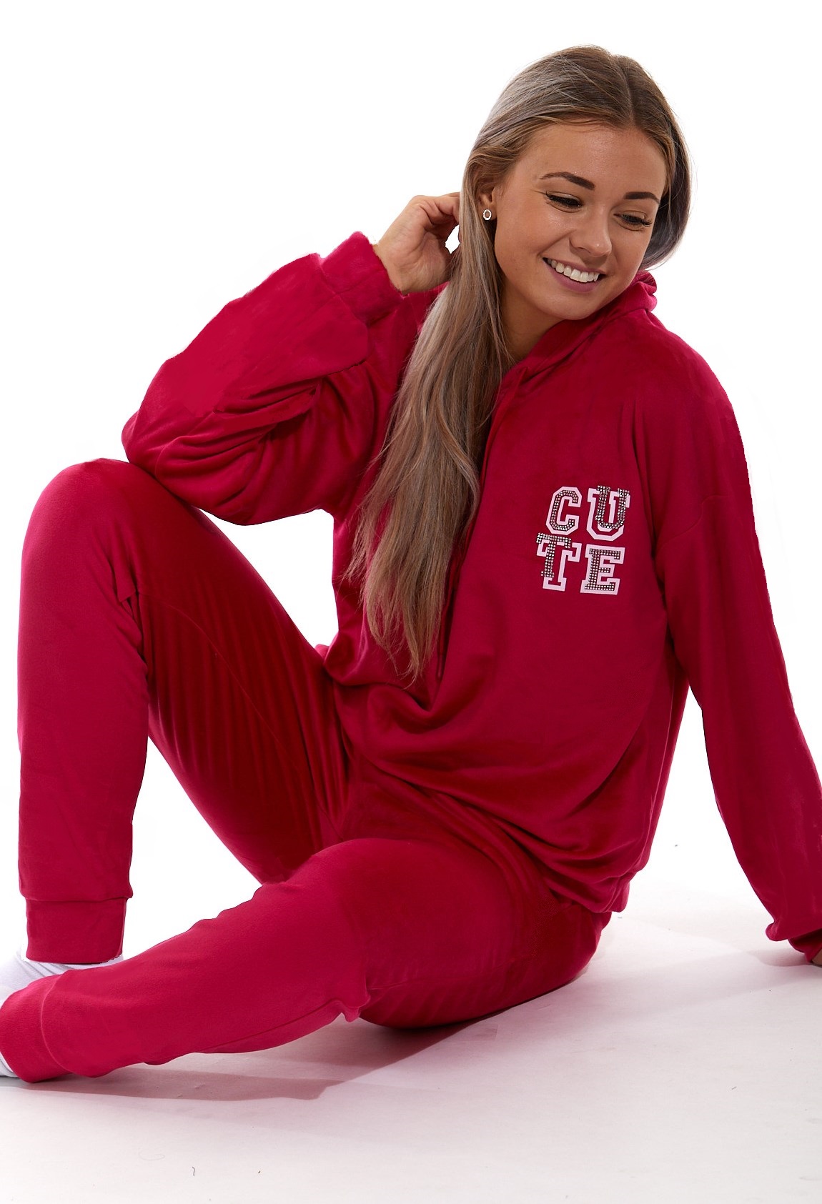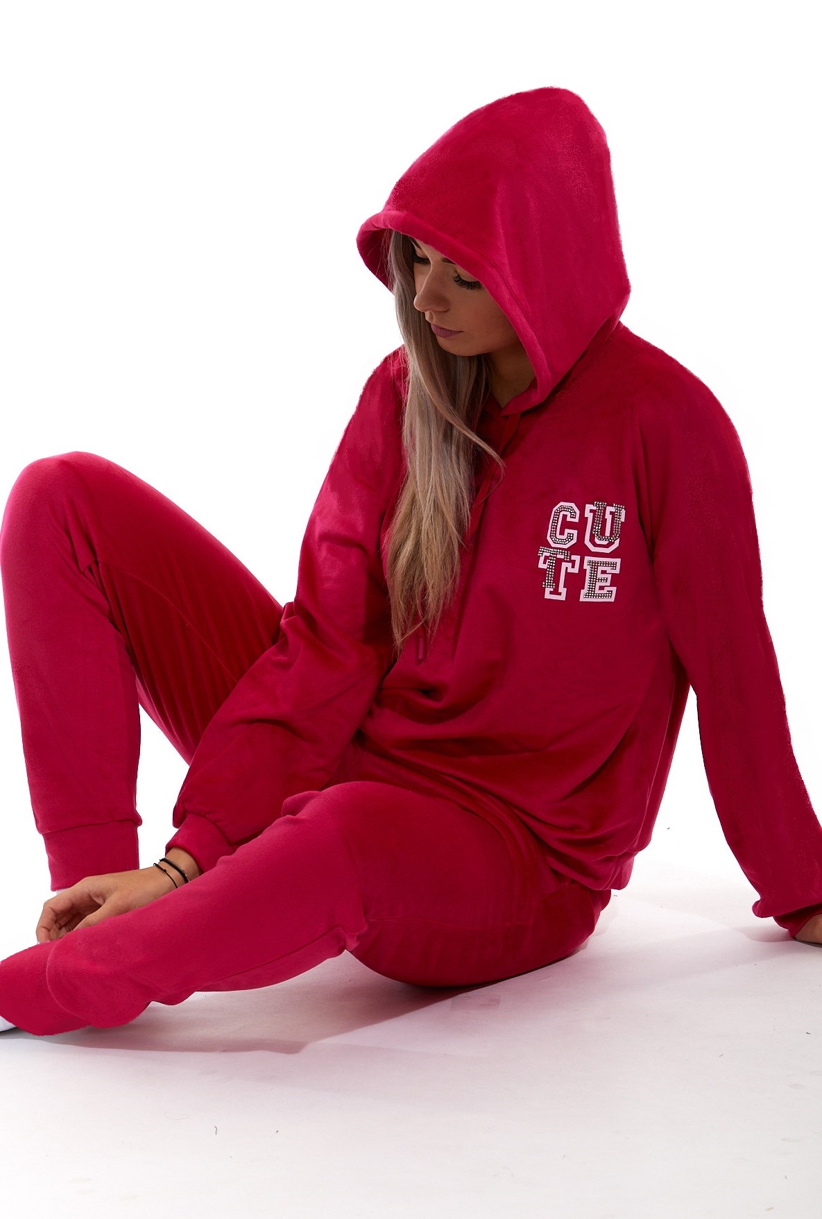 Růžové sametové teplé dámské pyžamo s kapucí CUTE