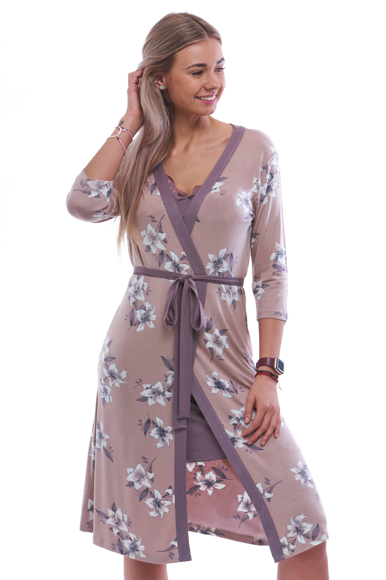 Župan v klasickém zavinovacím střihu snadno sladíte i s další košilkou nebo pyžamem. Díky odlehčené a pružné viskóze je komplet ideální do teplých prostor i na letní období.
