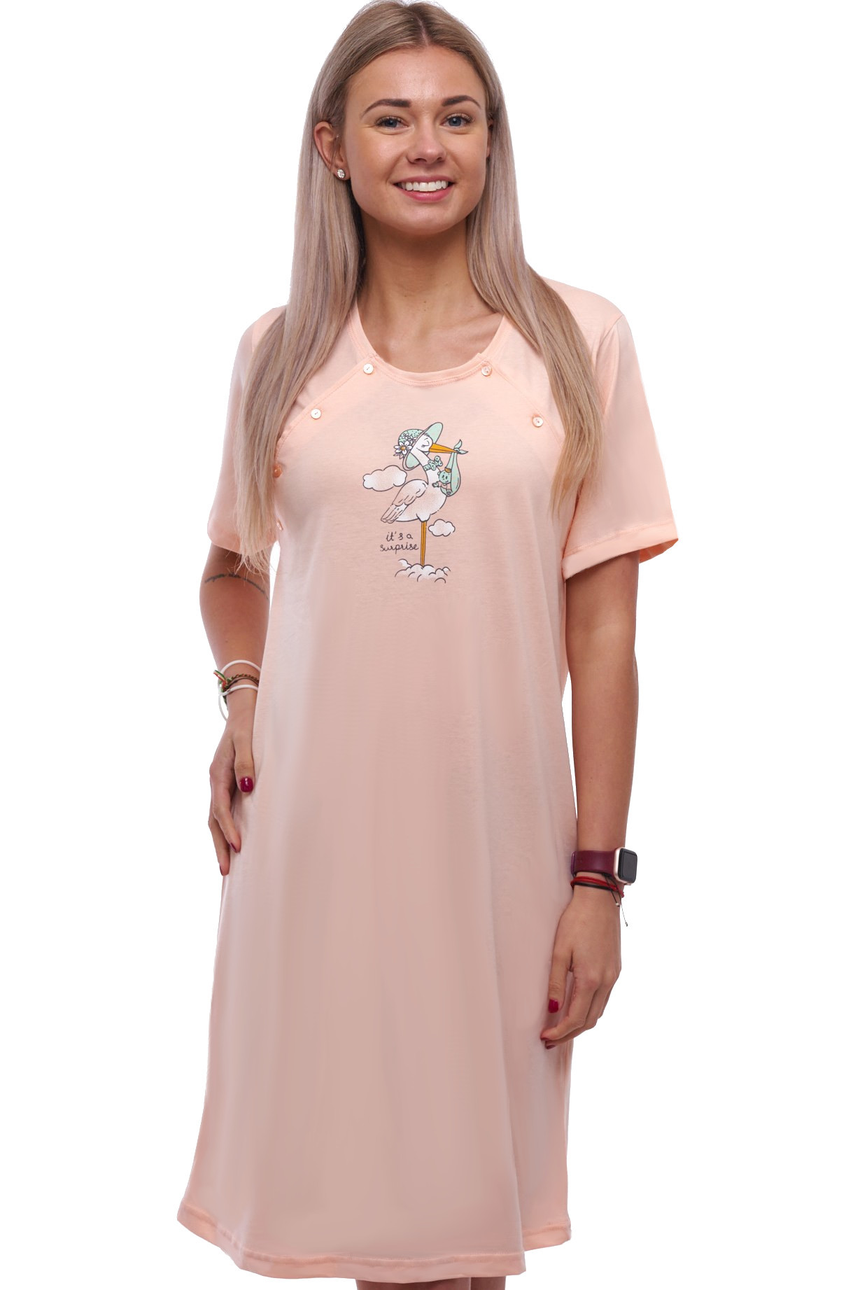 Pohodlná noční košilka v klidné meruňkové barvě, vyrobená z kvalitní 100% bavlny. Dvojité propínání na knoflíky od ramene usnadňuje oblékání a přináší praktické pohodlí. Košilku zdobí jemný motiv čápa s miminkem v zobáku – roztomilý detail, který potěší nejen maminky, ale každou ženu s láskou k něžnosti a symbolice. Skvělá volba pro noční odpočinek i domácí pohodu.