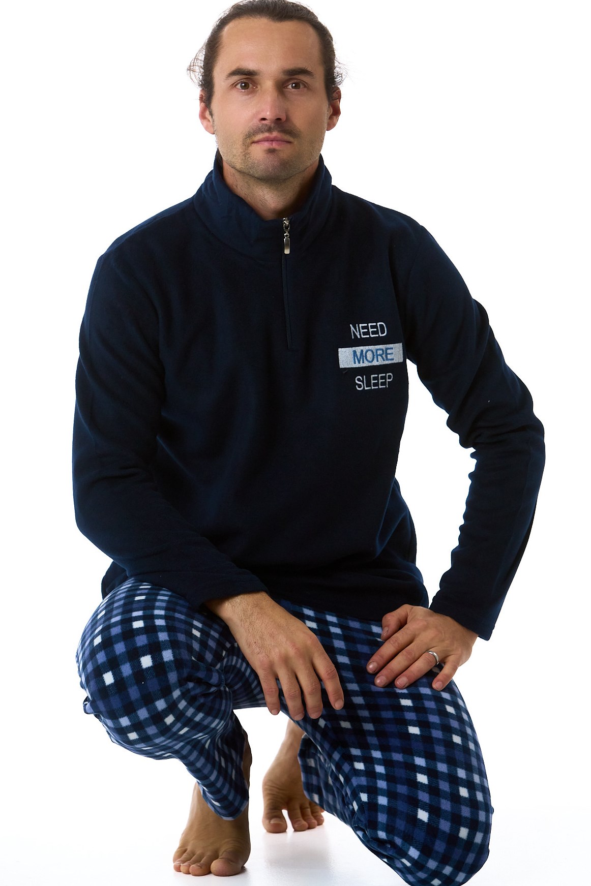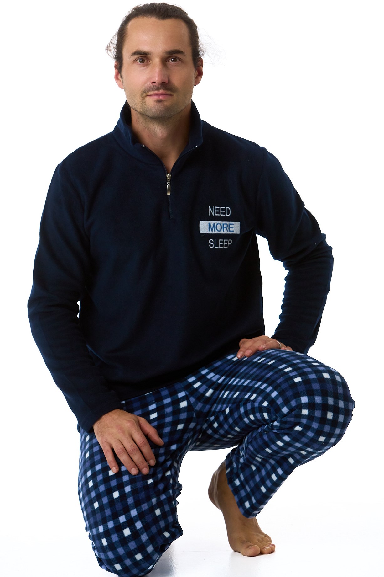 Modré a kostkované hřejivé pánské pyžamo se zipem u krku - Potřebuji více spánku
