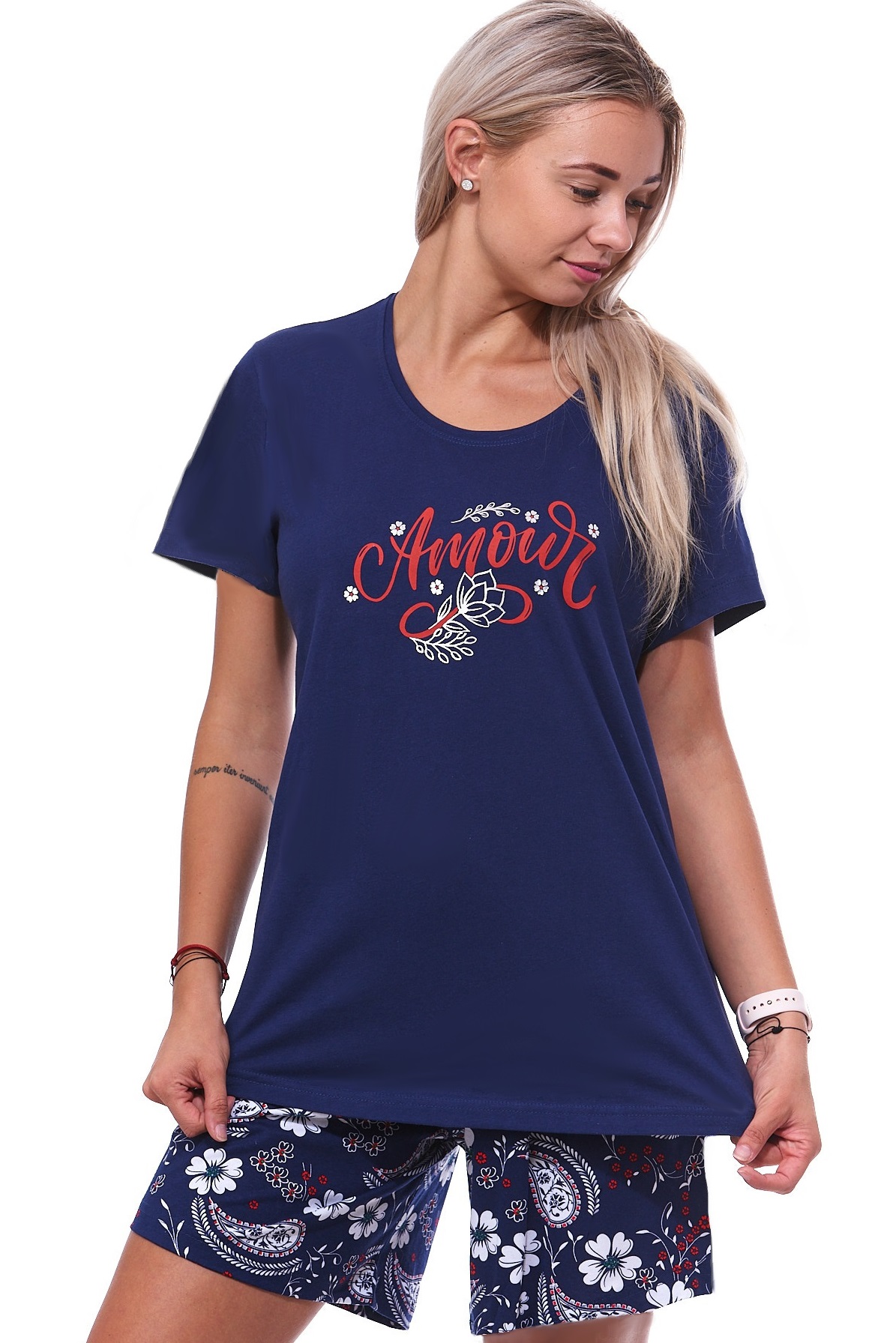 Modré, bílé i červené mandalové pyžamo pro plnoštíhlé ženy či dívky s krátkou nohavicí AMOUR
