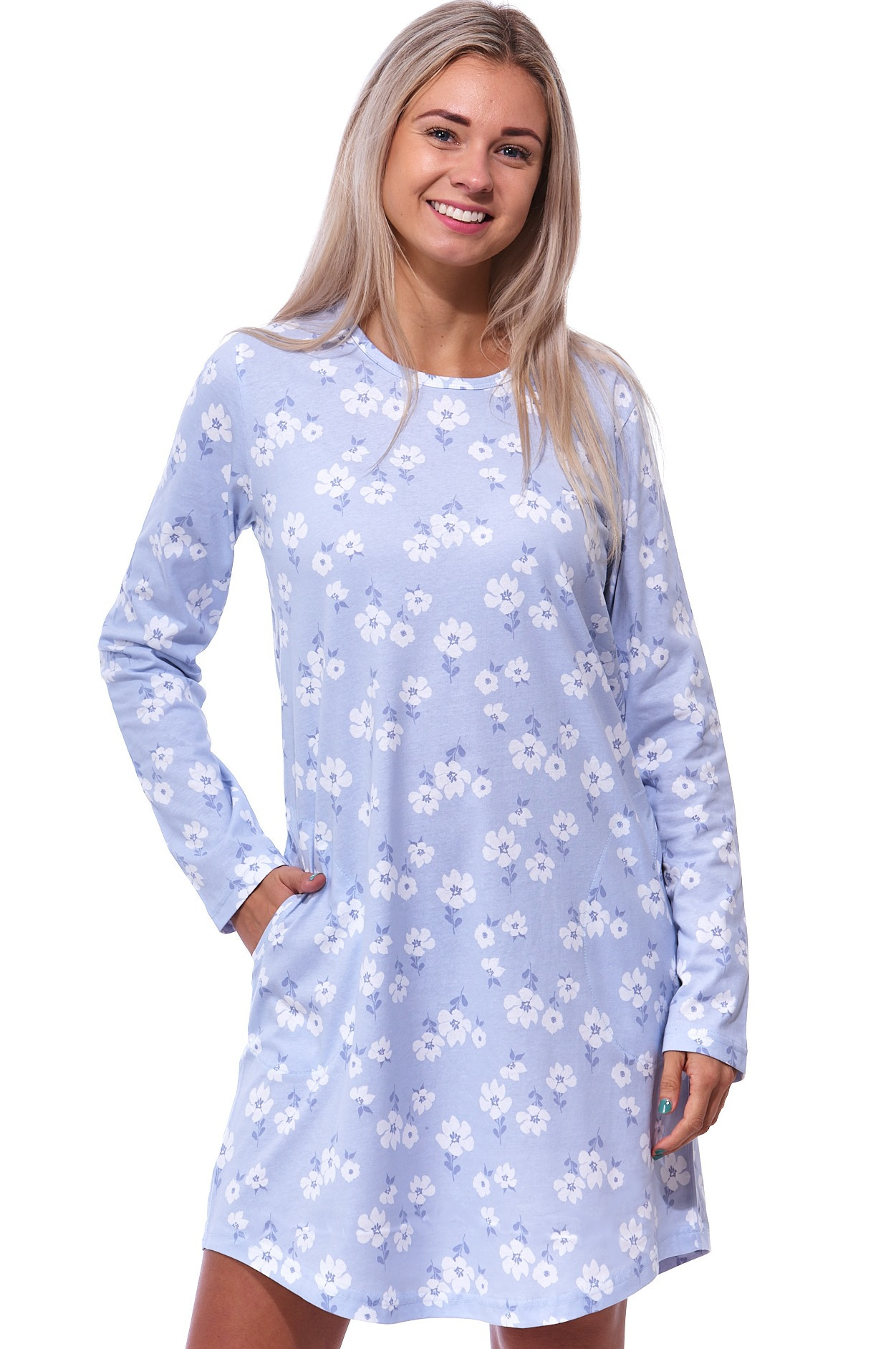 Nebesky modrá květovaná noční košilka s dlouhými rukávy pro ženy či dívky. Dámská noční košilka s dlouhými rukávy – dokonalé spojení pohodlí a elegance pro chladnější noci. Vyrobena z příjemného jemného materiálu ze 100% bavlny, který je prodyšný, měkký a šetrný k pokožce. Kvalitní zpracování zajistí dlouhou životnost i po častém praní. Originální design přináší jedinečný vzhled a styl, který zaujme každou ženu. Ideální volba pro ty, kteří hledají komfortní noční prádlo s dlouhými rukávy, které poskytuje teplo i eleganci během spánku.