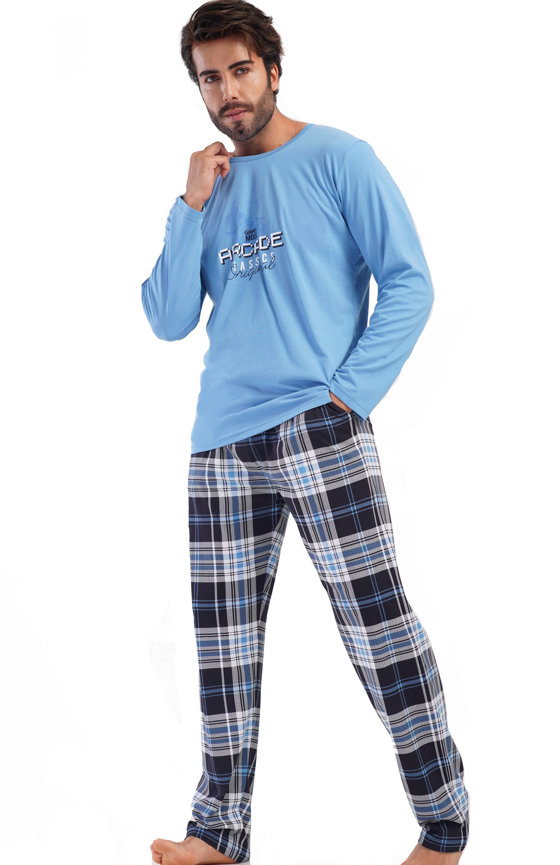 Nebesky modré kárované pyžamo pro muže gamer mood ARCADE CLASSICS originál