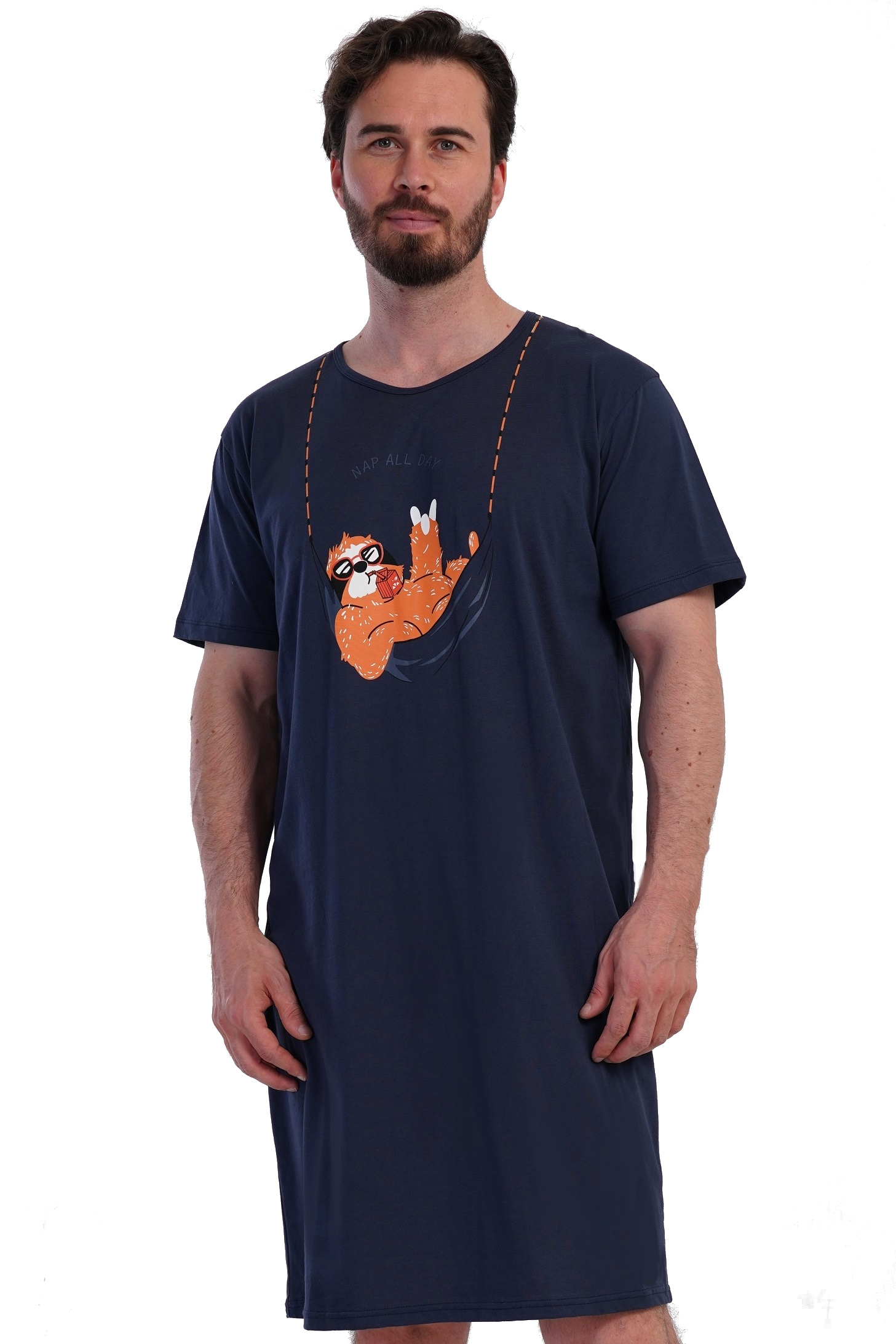 Tmavě modrá pánská noční košile pro všechny, kdo mají smysl pro humor a chtějí pohodlí při spánku i lenošení. Toto spací tričko (maxitriko) s krátkým rukávem je vyrobeno ze 100% bavlny a má volný, pohodlný střih. Na prsou dominuje veselý obrázek lenochoda, který si užívá relax v houpací síti a popíjí pitíčko brčkem z krabičky. Nad obrázkem je nápis „NAP ALL DAY“ – jasné poselství pro všechny, kdo si umí odpočinout stylově.
