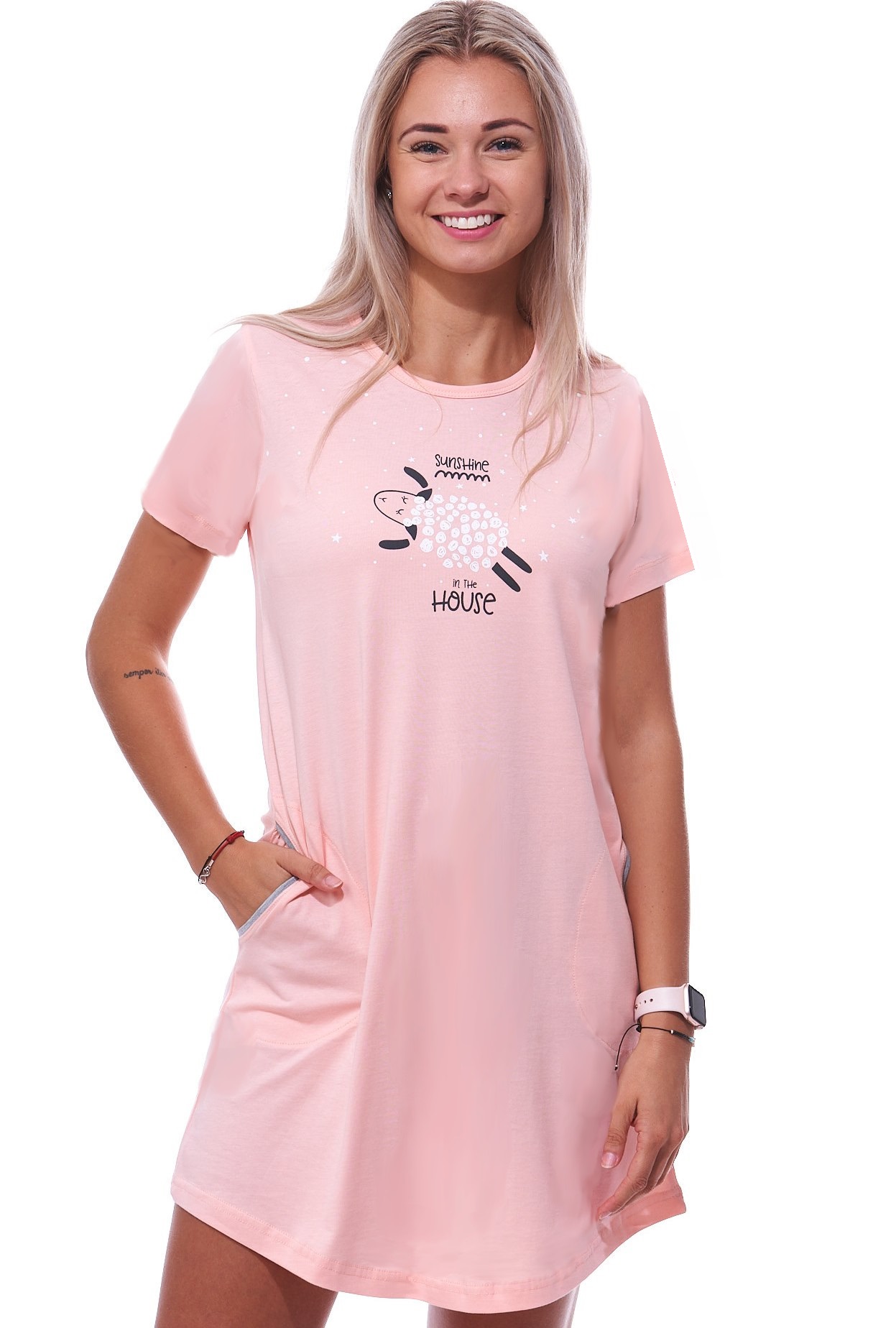 Růžová noční košilka s krátkými rukávy pro ženy či dívky s ovečkou. Dámská noční košilka s krátkými rukávy – pohodlný a stylový doplněk pro váš noční šatník. Vyrobena z příjemného jemného materiálu ze 100% bavlny, který poskytuje prodyšnost a maximální pohodlí. Kvalitní zpracování zaručuje dlouhou životnost a trvanlivost i při každodenním nošení. Originální design dodává košilce jedinečný vzhled, který ocení každá žena. Perfektní volba pro klidný spánek s dotekem elegance.