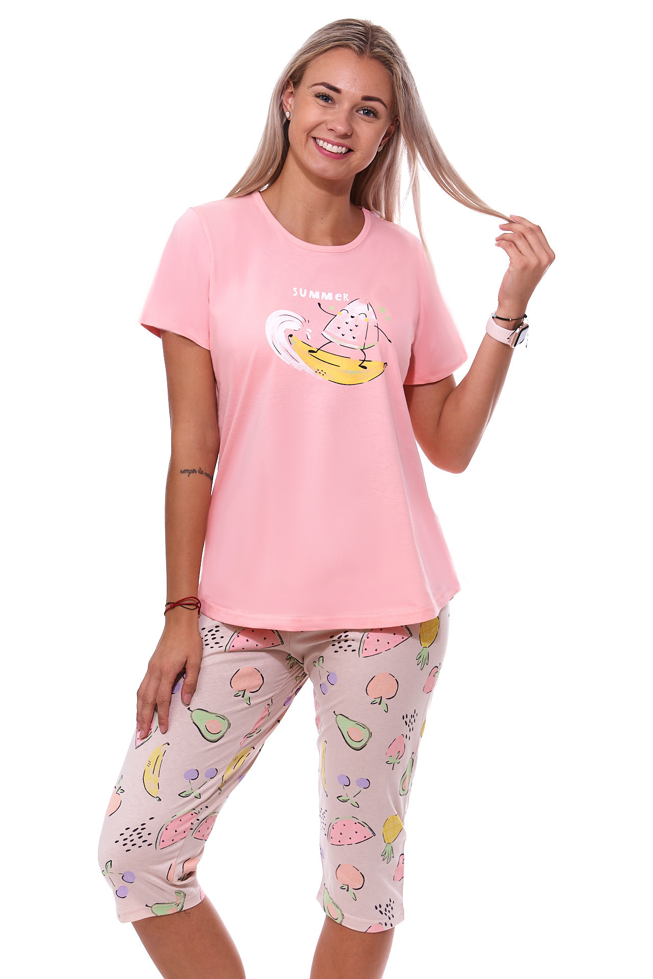 Růžové béžové a duhově vzorované pyžamo pro ženy či dívky s 3/4 nohavicí pro milovnice ovoce