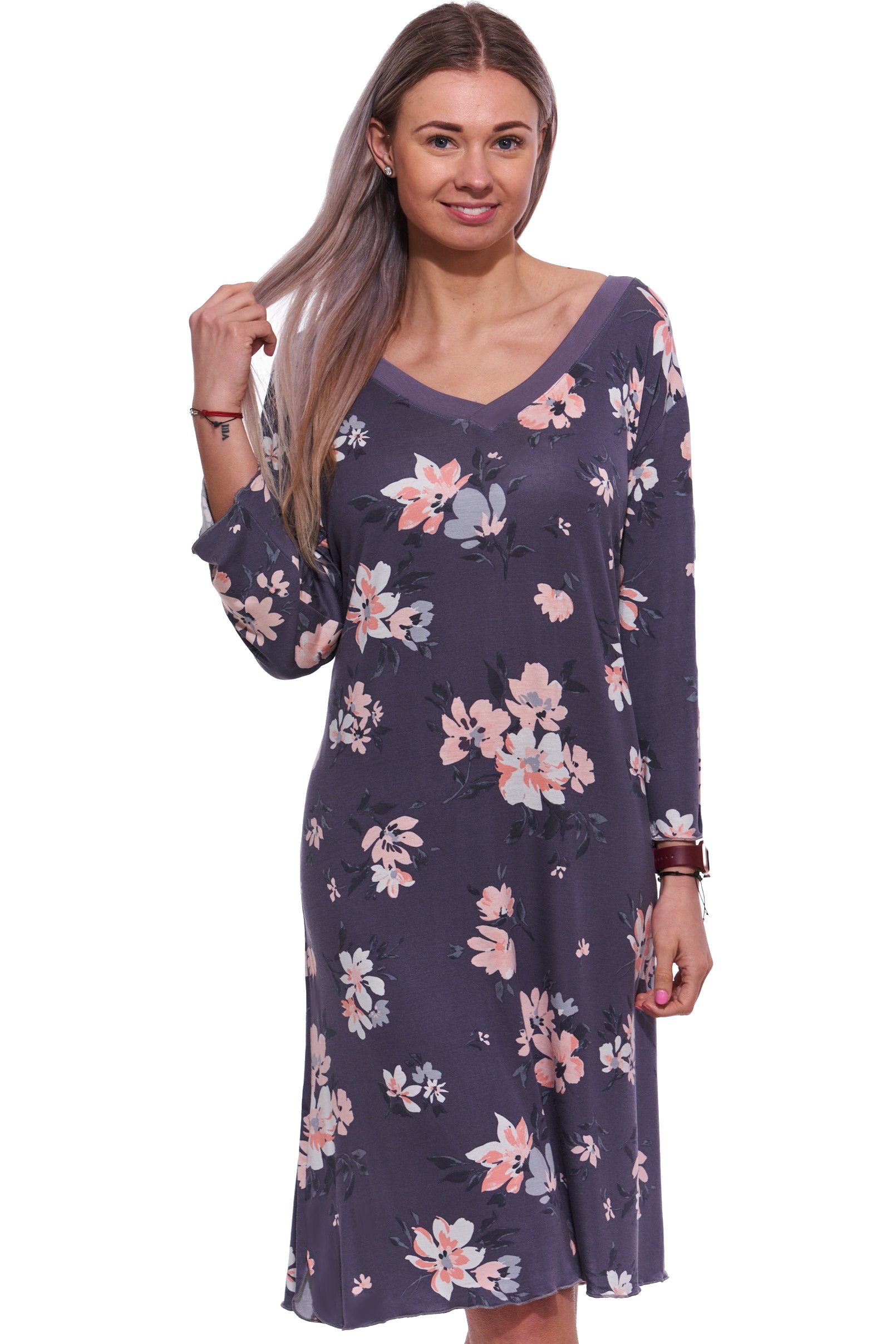 Šedá a růžově květovaná luxusní jemná noční košilka pro plnoštíhlé ženy s 3/4 rukávy. Vstupte do světa luxusu a elegance s naší noční košilkou. Vyrobena je z hedvábně jemného materiálu, který se příjemně přizpůsobuje vašemu tělu a je velice jemný na dotek, tato košilka vám poskytne nezapomenutelný zážitek nočního odpočinku. Díky kvalitnímu zpracování a originálnímu designu bude každá noc nejen pohodlná, ale i stylová. Dopřejte si nadstandardní komfort a krásu s tímto elegantním kouskem. Extra pružný materiál.