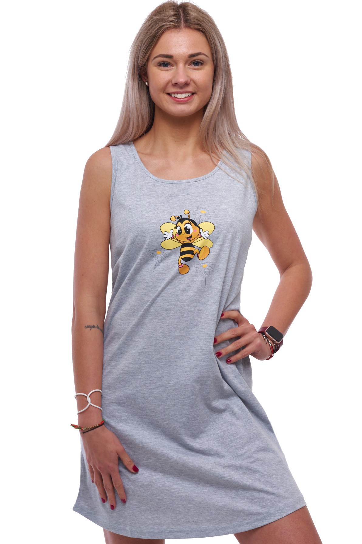 Šedá dámská noční košilka bez rukávů s včelkou nebo s čmelákem – ideální kombinace pohodlí a elegance. Vyrobena z jemného materiálu ze 100% bavlny, který je prodyšný a měkký na dotek, zajišťující maximální komfort během spánku. Kvalitní zpracování zaručuje dlouhou životnost i po opakovaném praní. Originální design přináší stylový vzhled, který ocení každá žena. Skvělá volba pro ty, kteří hledají komfortní a vkusné noční prádlo.