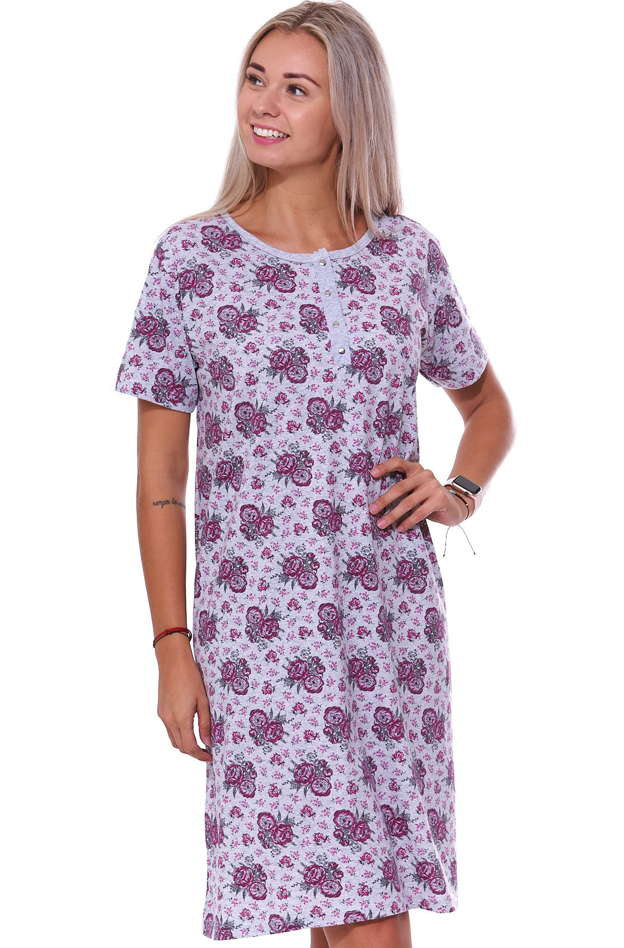 Šedá i malinová s růžičkama dlouhá noční košilka pro plnoštíhlé ženy či dívky na patentky u krku