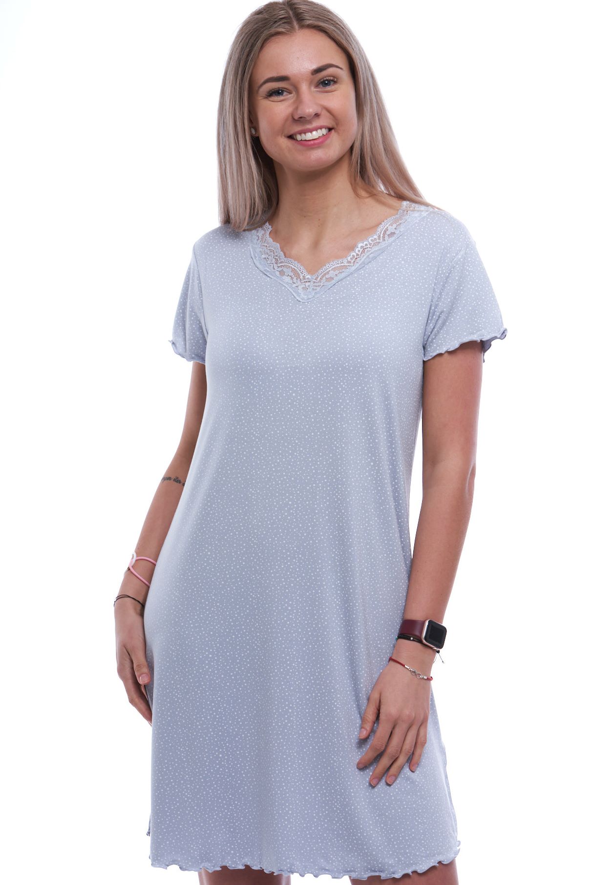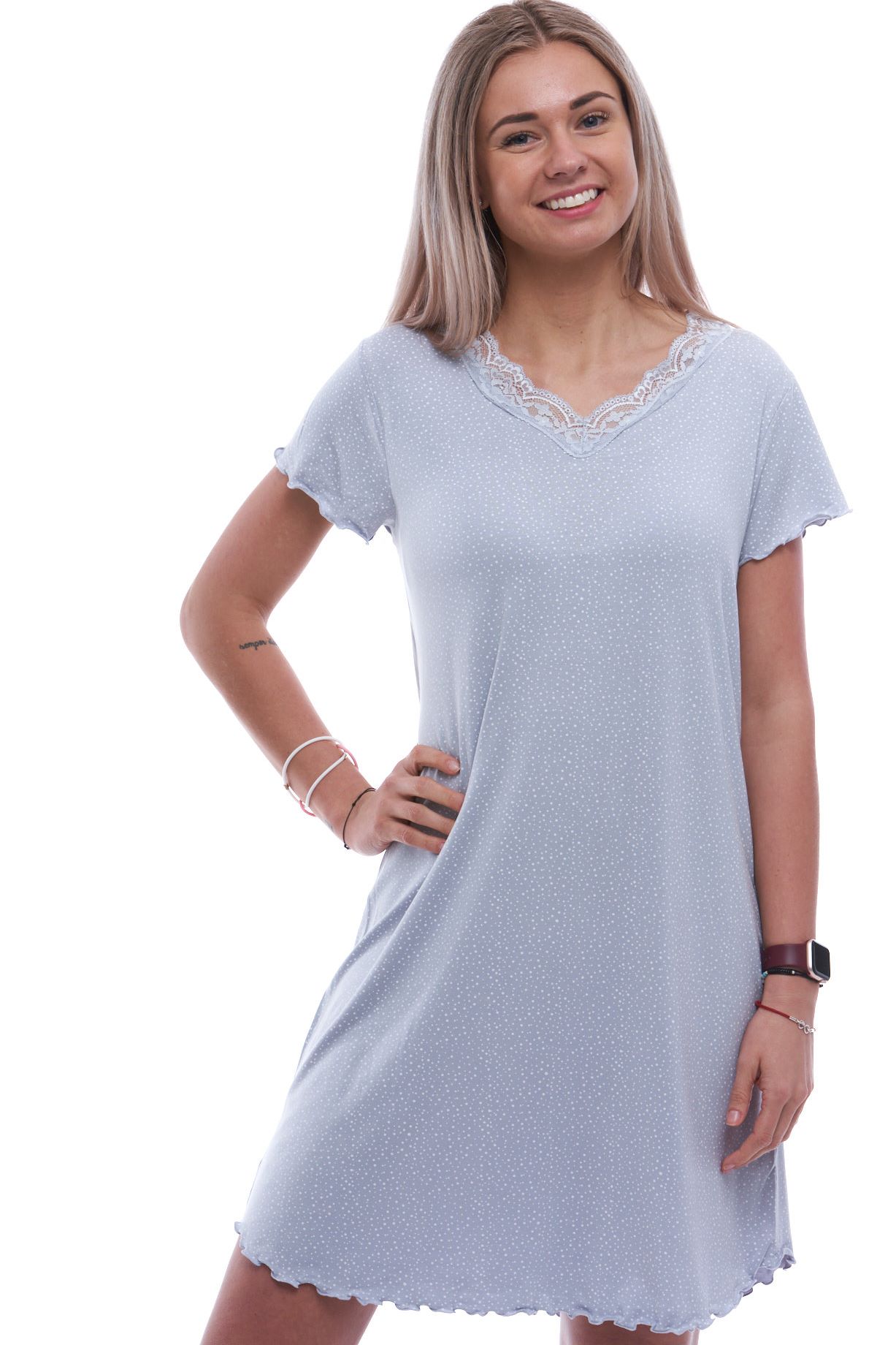 Šedá luxusní hedvábně jemná noční košilka s krajkou a bílým jemným vzorem 1XL-4XL. Objevte dokonalý komfort a eleganci s naší luxusní noční košilkou s krátkými rukávy. Vyrobená z hedvábně jemného materiálu, který je příjemně poddajný a jemný na dotek, nabízí tato košilka nezapomenutelný zážitek nočního odpočinku. Její kvalitní zpracování a originální design zajišťují nejen krásný vzhled, ale také maximální pohodlí. Dopřejte si dotek luxusu každou noc s tímto elegantním kouskem. Extra pružný materiál.