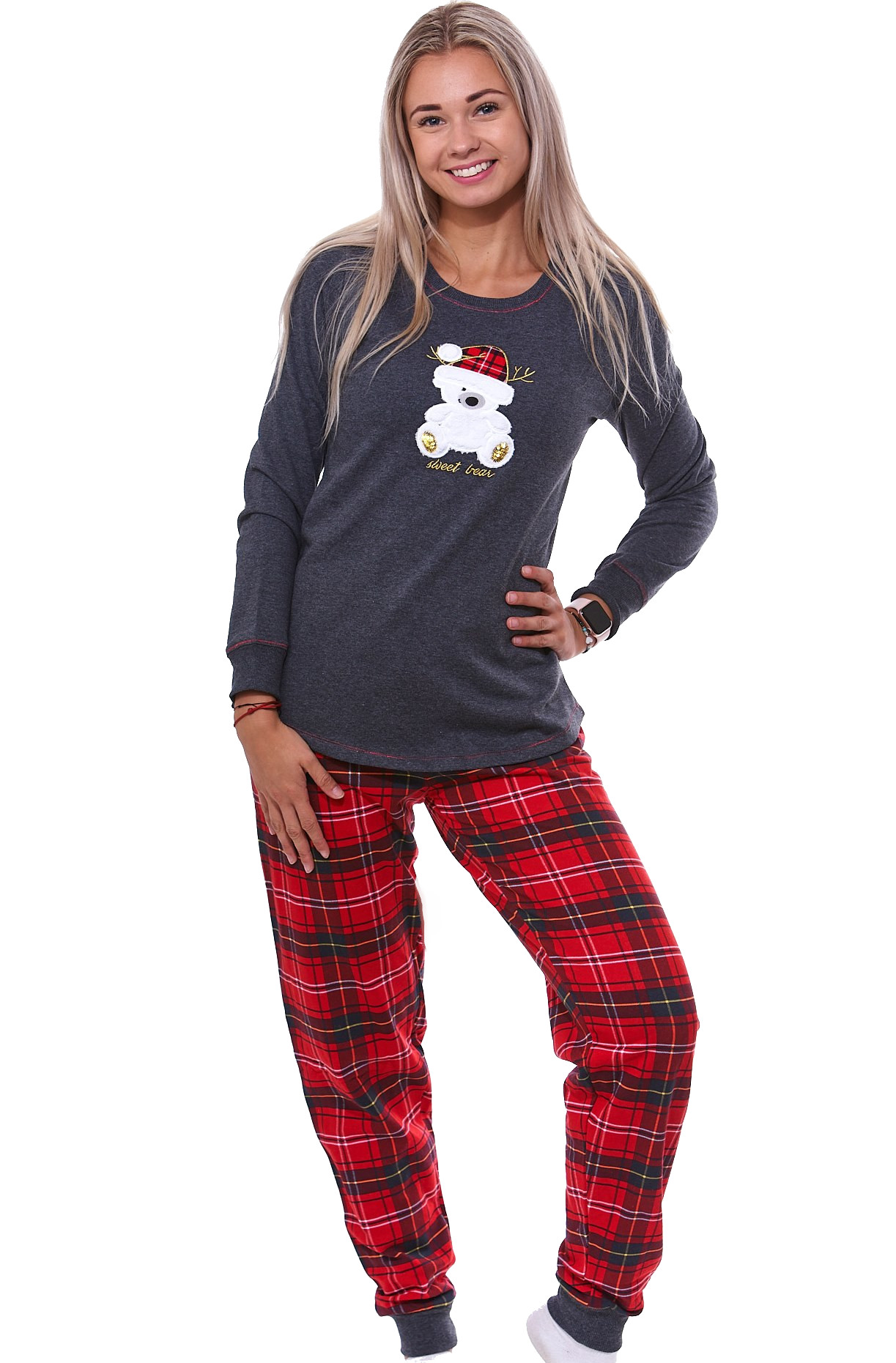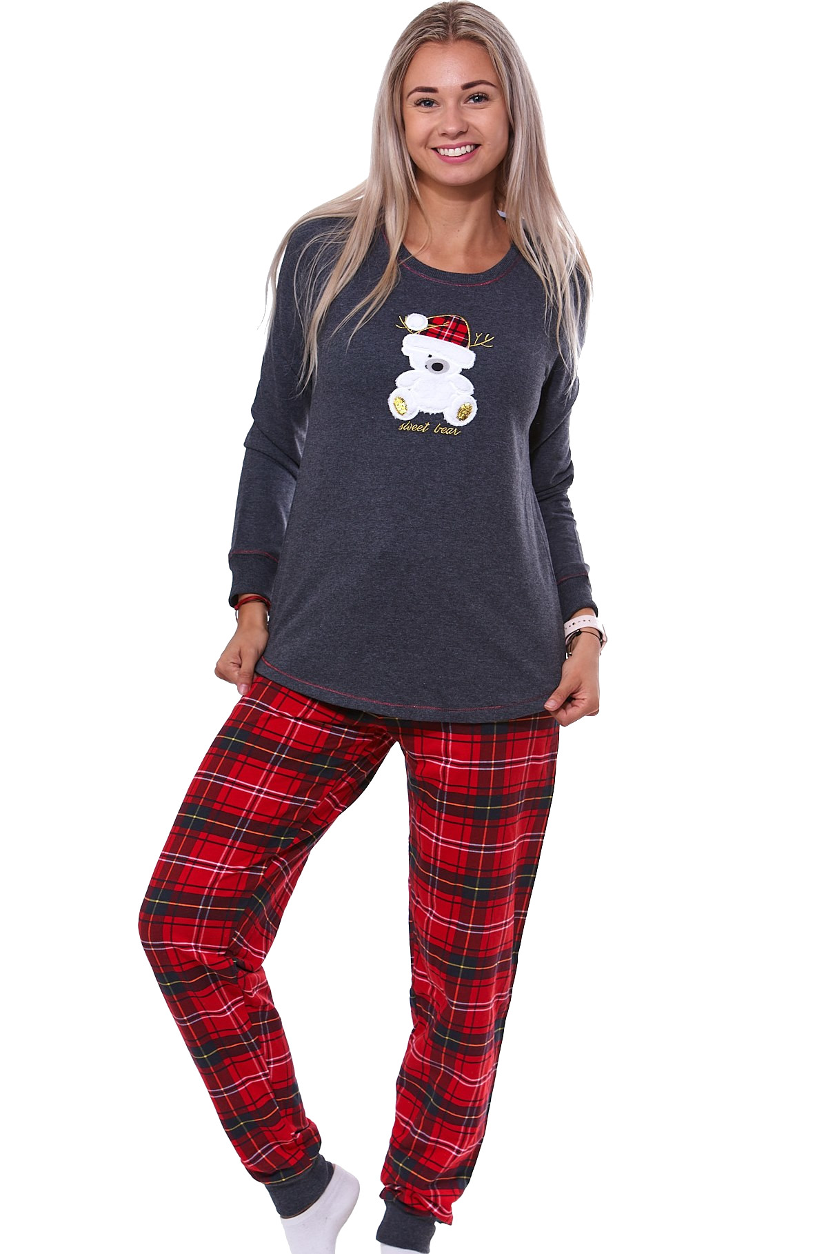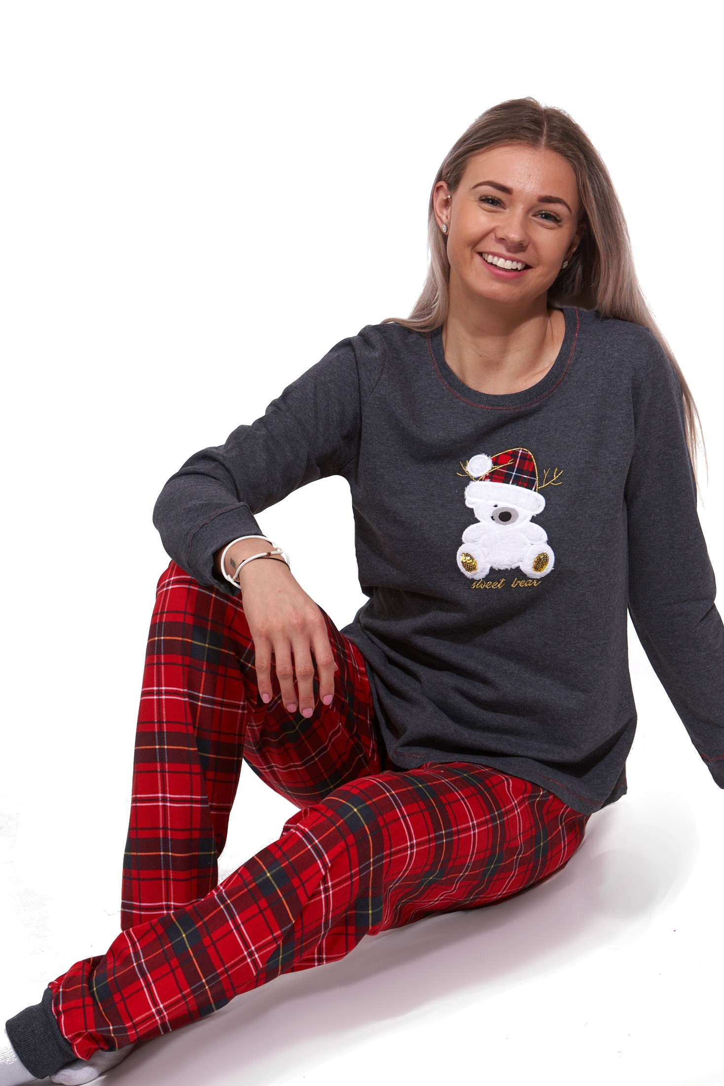 Šedé i červeně kárované luxusní hřejivé dámské pyžamo Vánoční plyšový medvídek