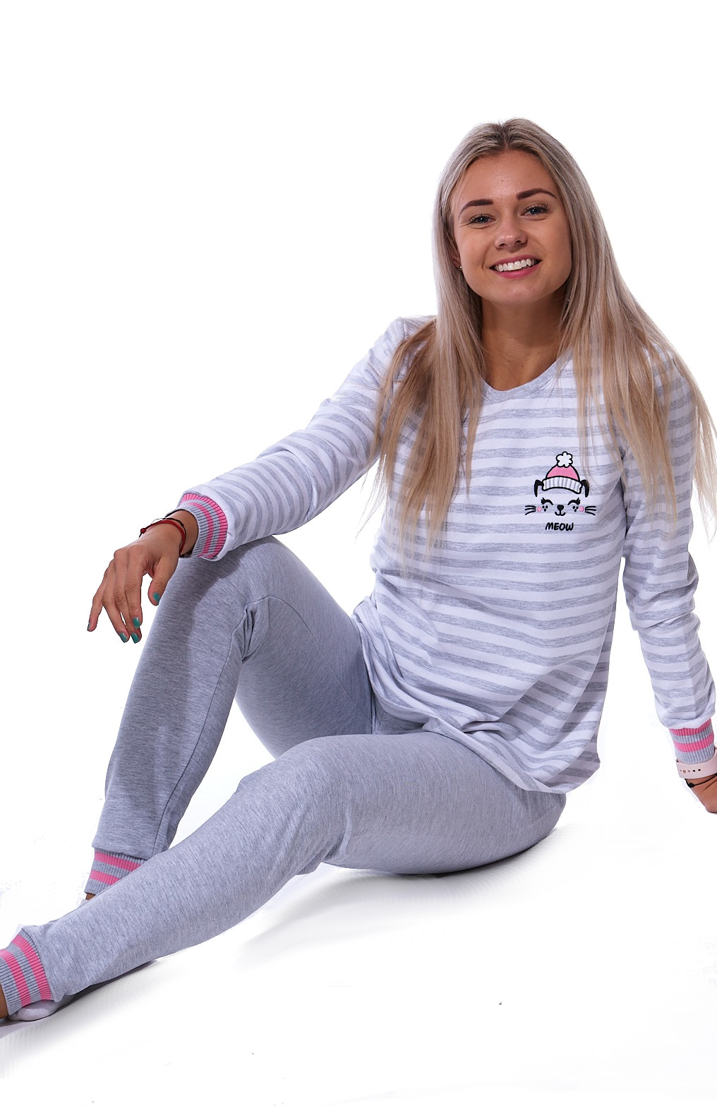 Šedé i pruhované luxusní hřejivé bavlněné dámské pyžamo pro ženy či dívky se zimní kočičkou