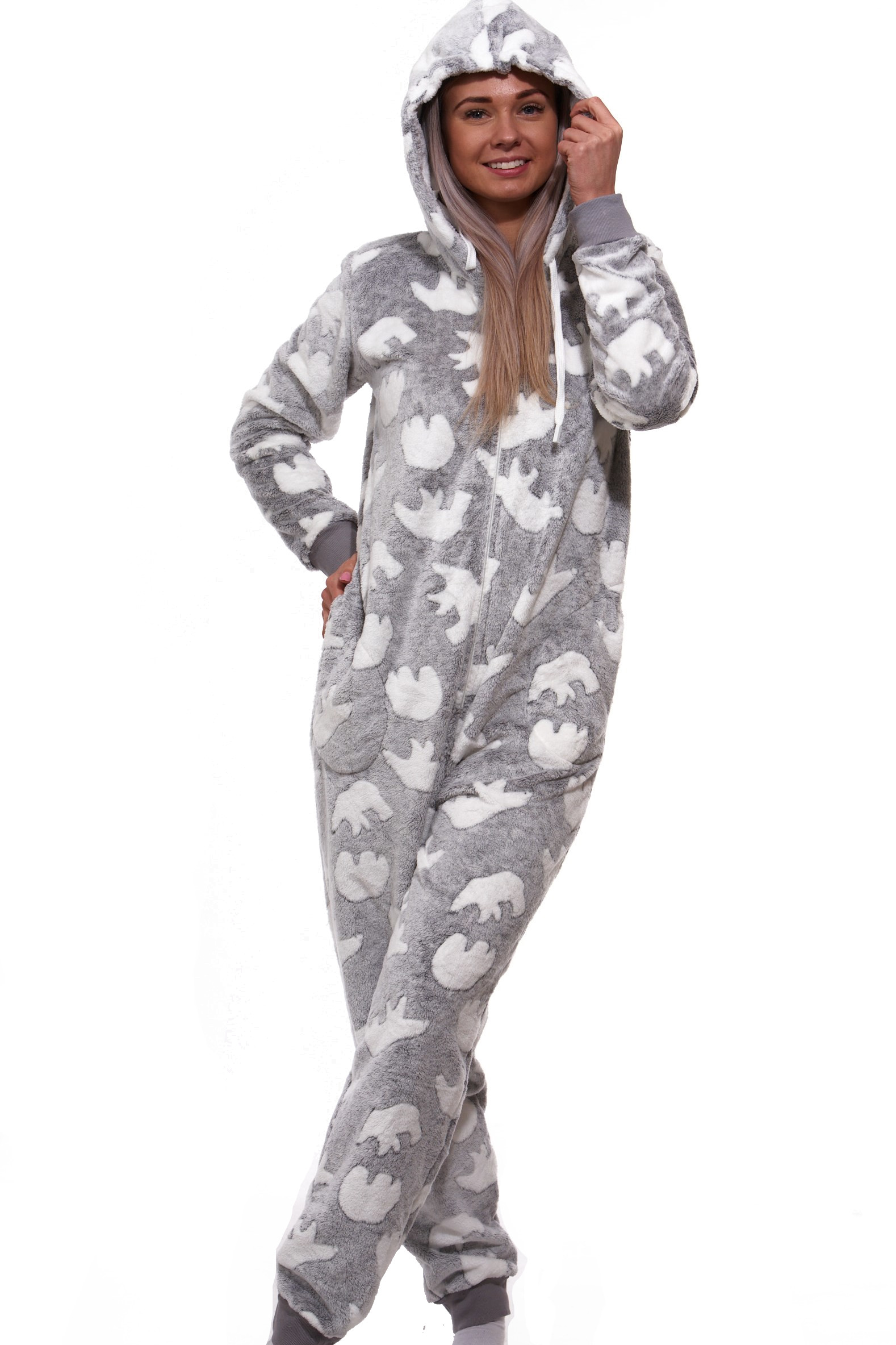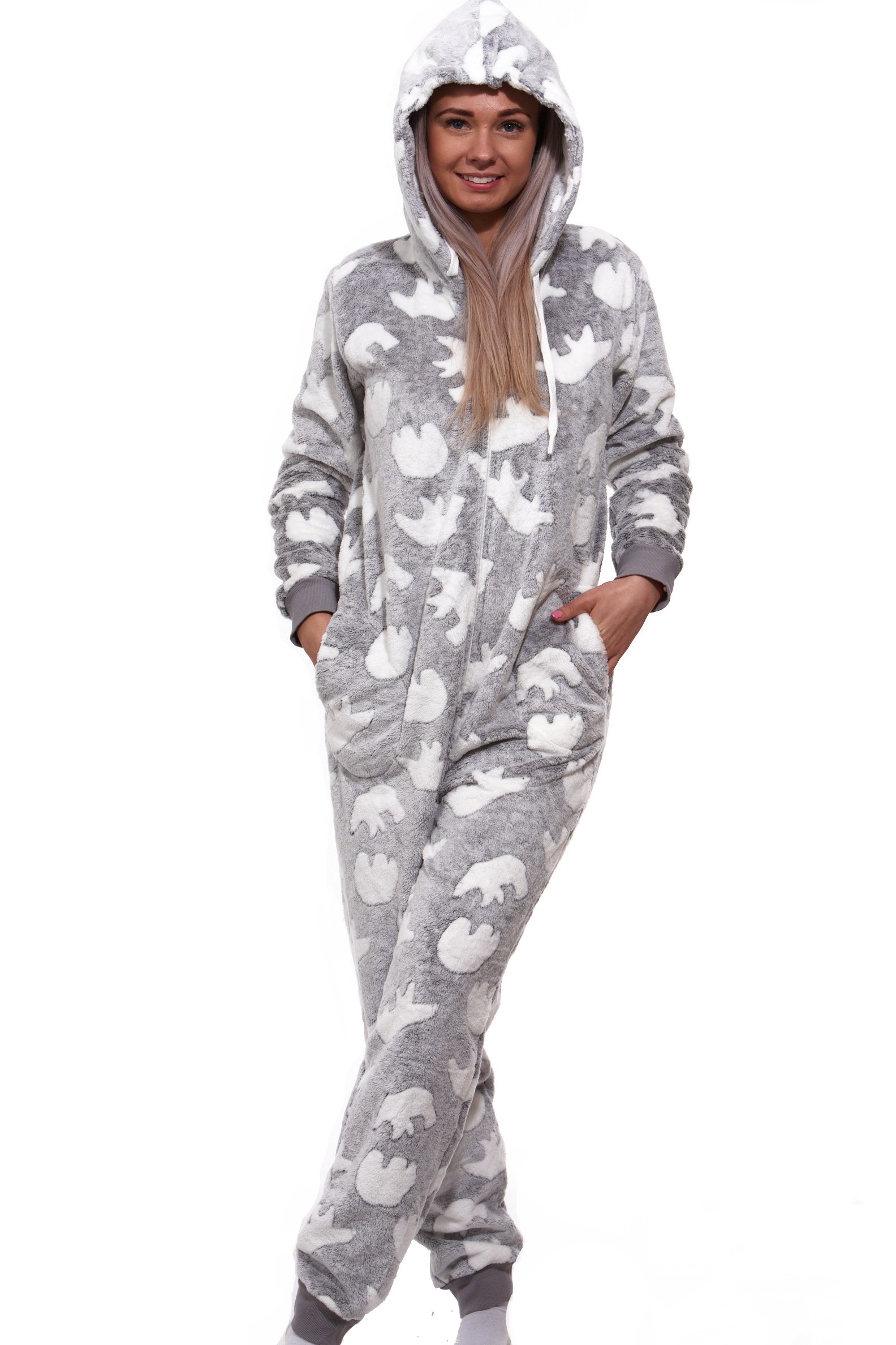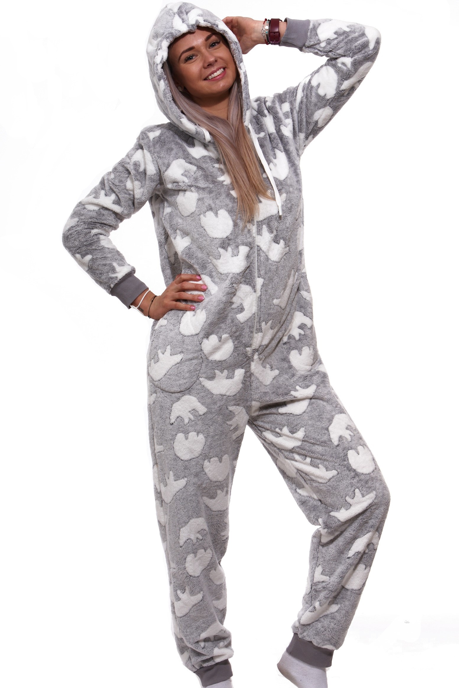 Šedý hřejivý extra huňatý funkční overal dámský s ledními medvědy