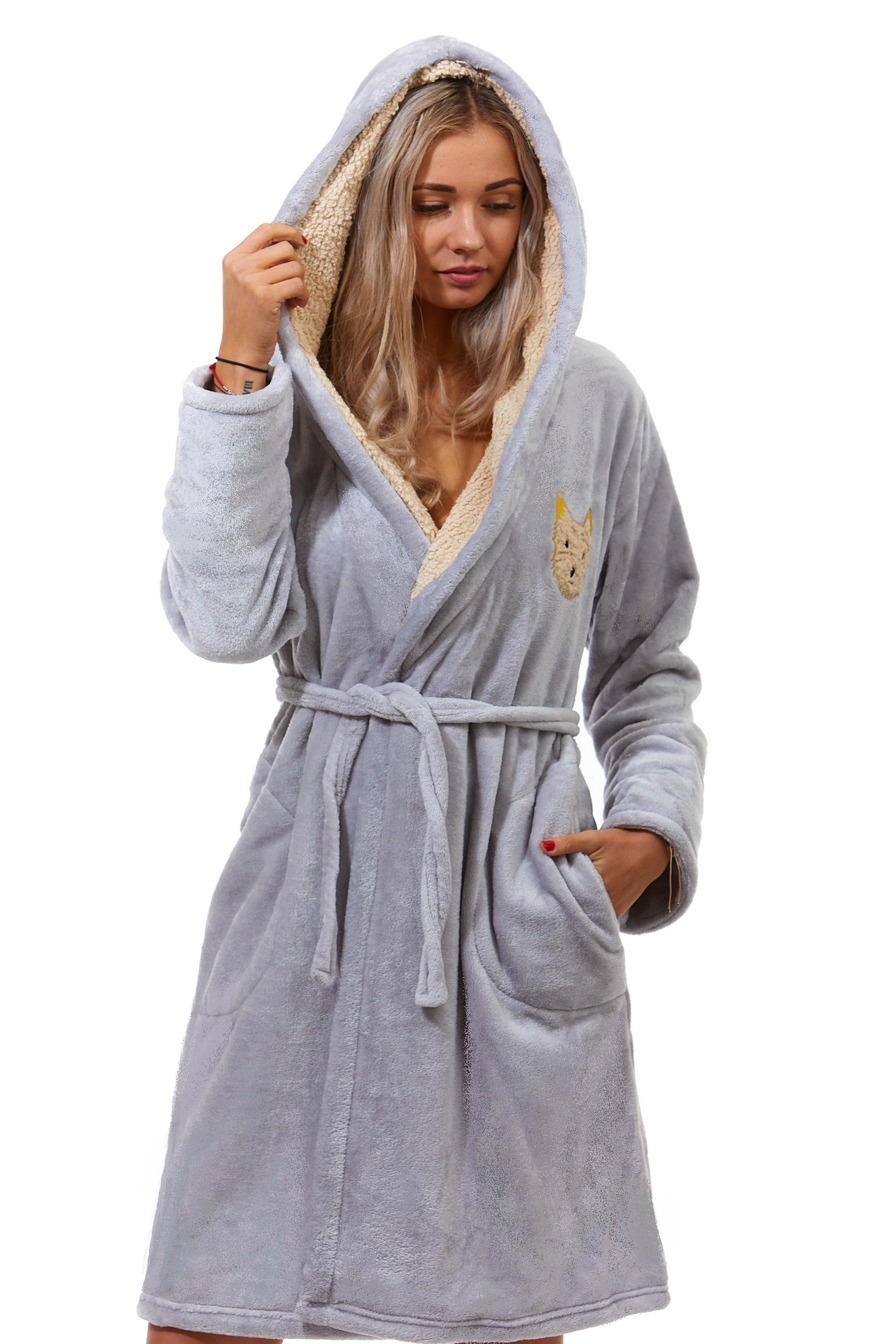 Šedý i béžový dámský župan huňatý z bambusu s beránkovou kapucí a pejskem