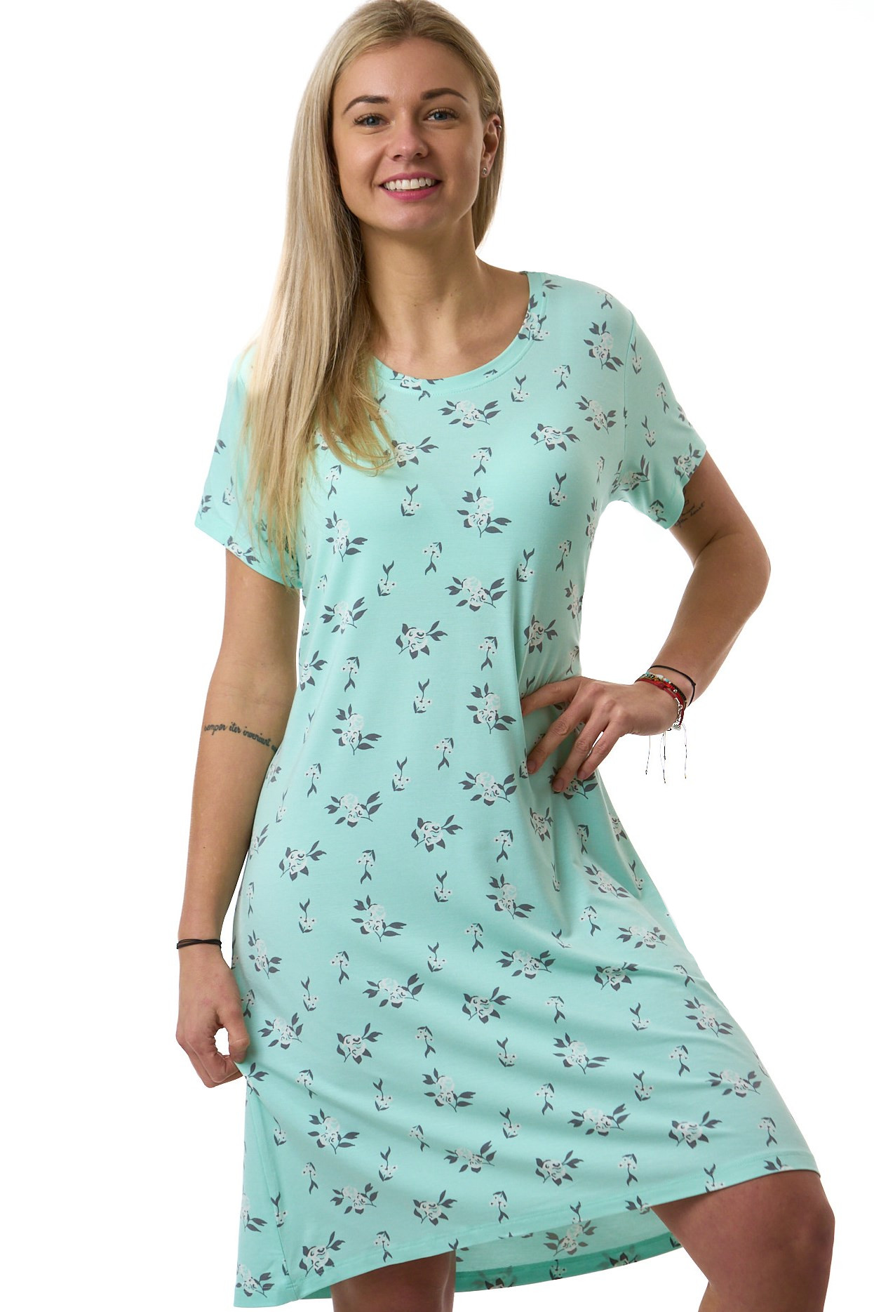 Světle zelinkavá, azurová luxusní jemná noční košilka pro plnoštíhlé ženy vzor šedé kvítí. Objevte dokonalý komfort a eleganci s naší luxusní noční košilkou s krátkými rukávy. Vyrobená z hedvábně jemného materiálu, který je příjemně poddajný a jemný na dotek, nabízí tato košilka nezapomenutelný zážitek nočního odpočinku. Její kvalitní zpracování a originální design zajišťují nejen krásný vzhled, ale také maximální pohodlí. Dopřejte si dotek luxusu každou noc s tímto elegantním kouskem. Extra pružný materiál.