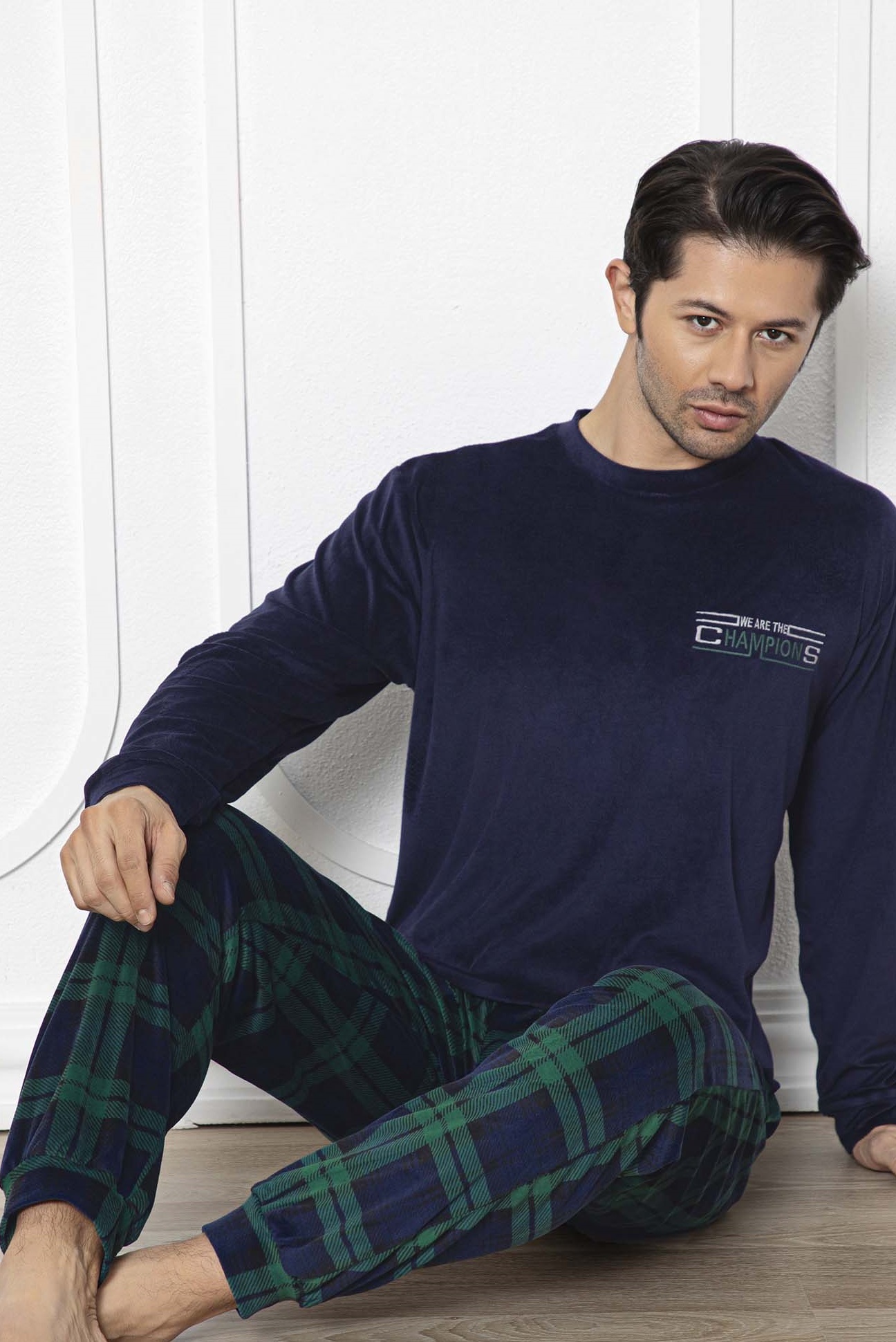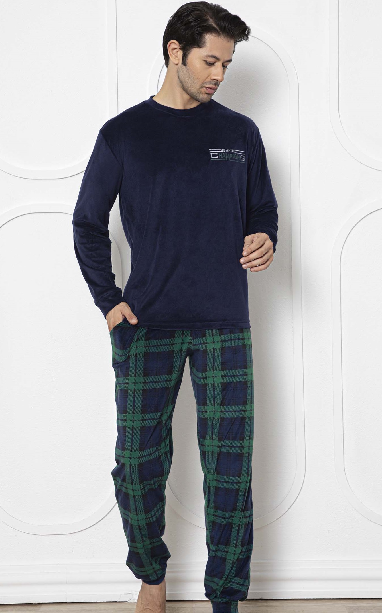 Tmavě modré a zeleně kárované TERMO hřejivé pánské pyžamo Champions