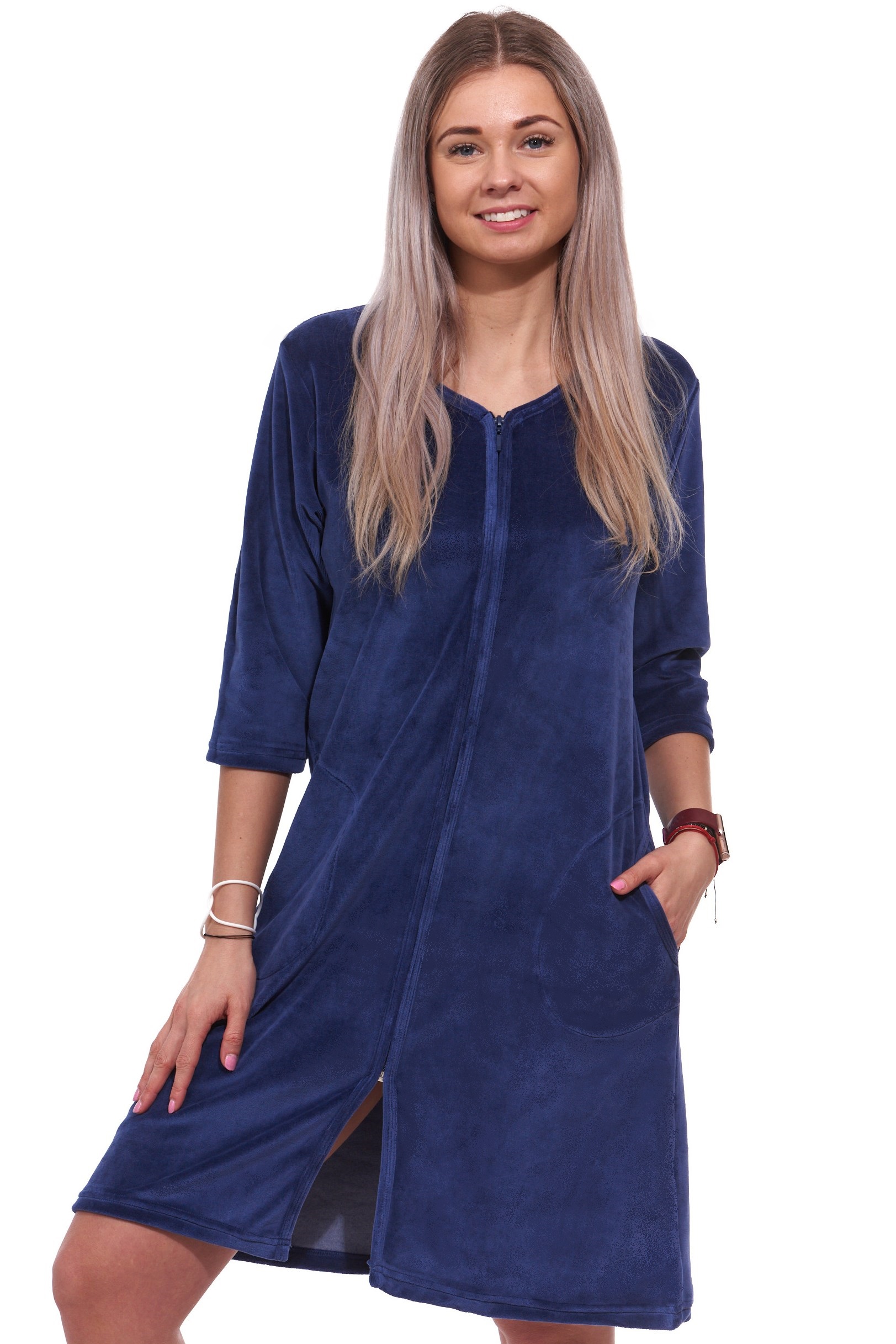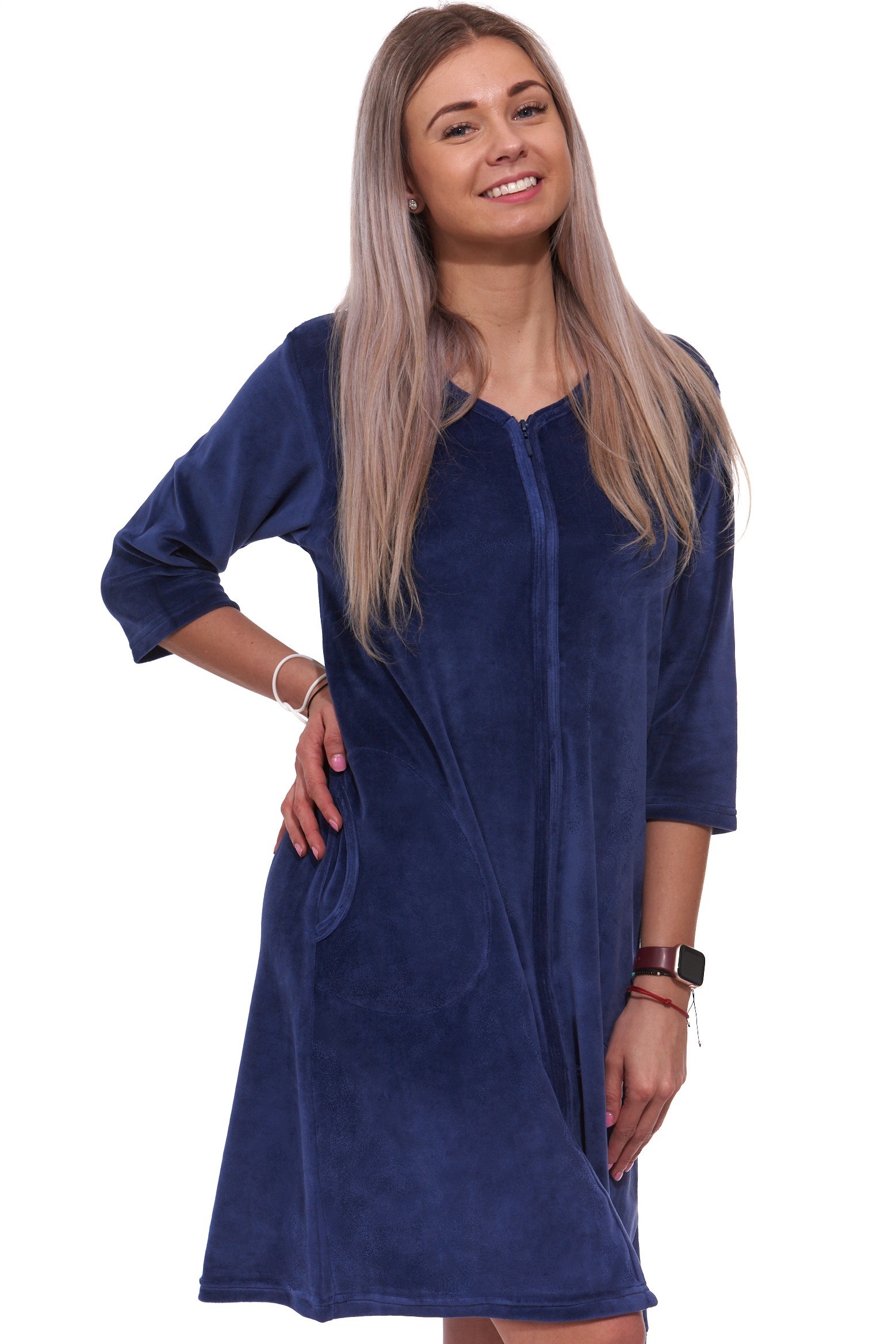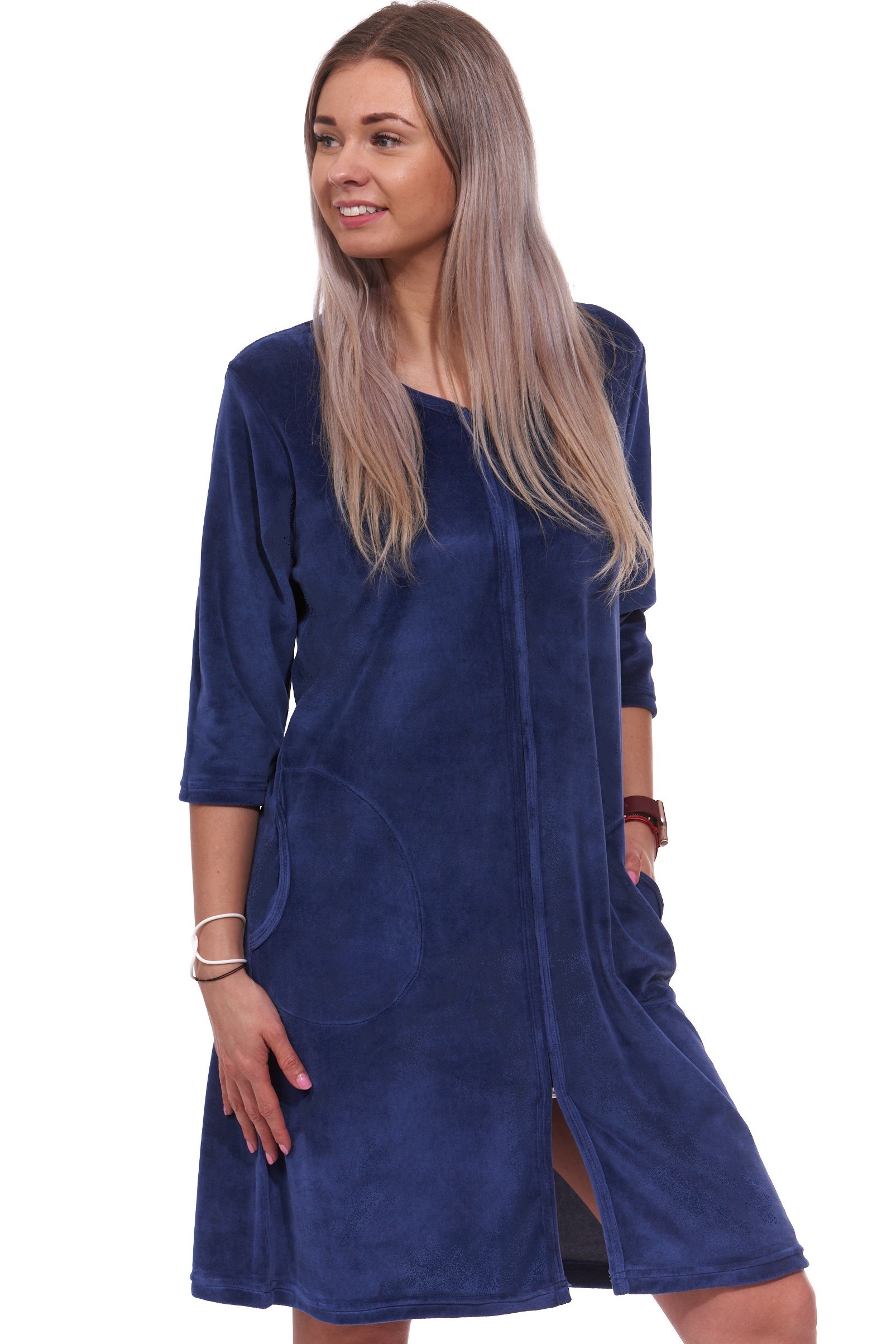 Tmavě modrý elegantní hřejivý župan na zip ze sametu