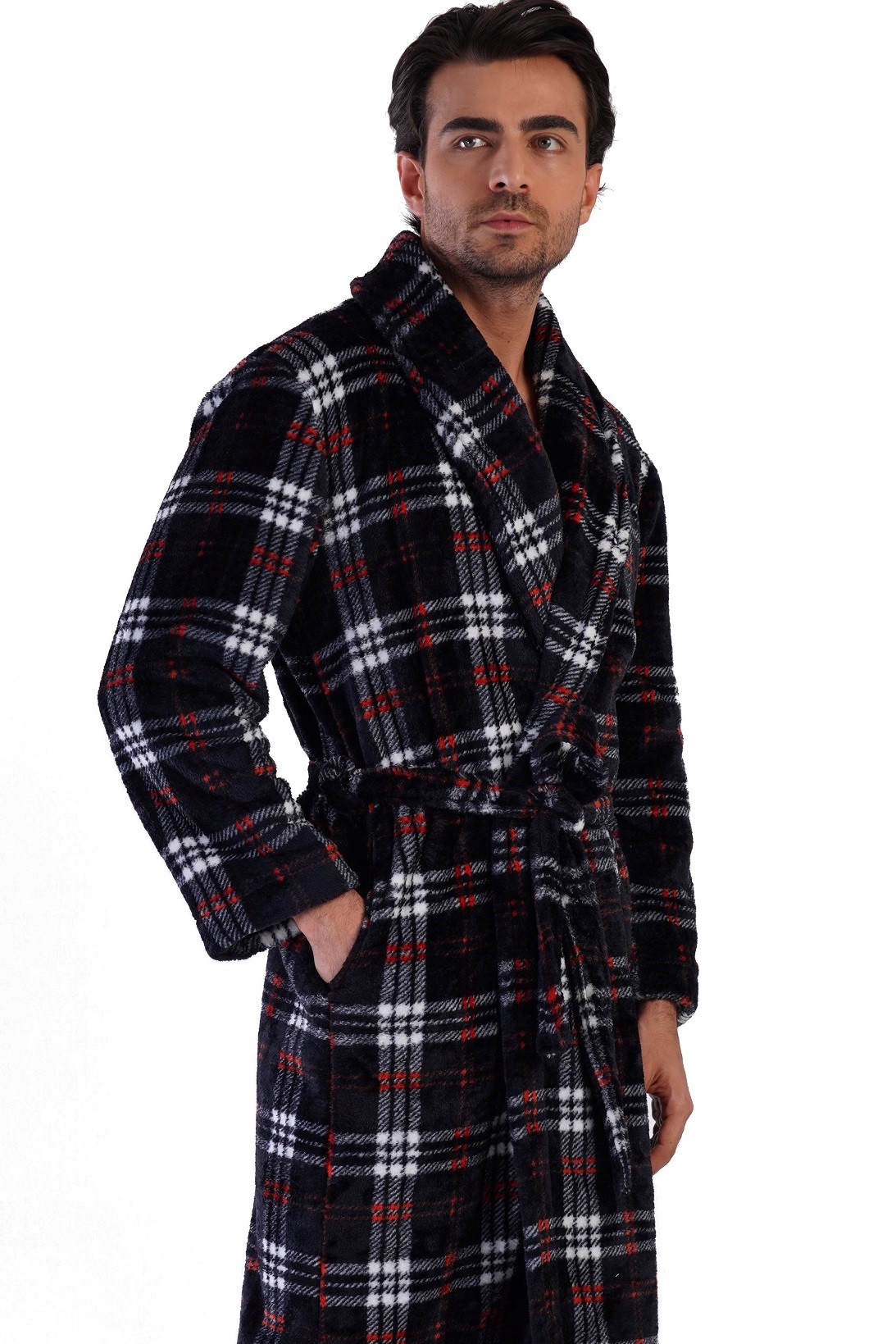 Župan pro muže huňatý károvaný šedý i červený